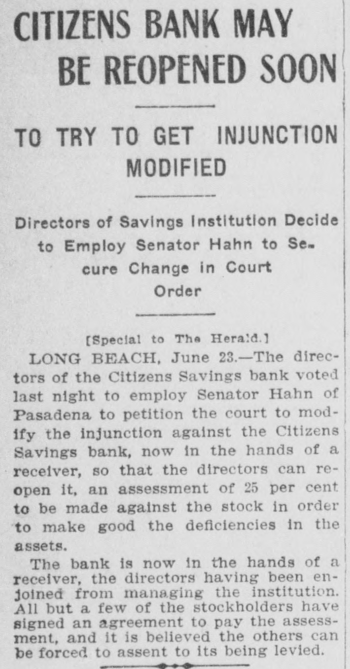 CITIZENS BANK MAY BE REOPENED SOON TO TRY TO GET INJUNCTION MODIFIED Directors of Savings Institution Decide to Employ Senator Hahn to Secure Change in Court Order [Special to The Herald.] LONG BEACH, June 23.-The directors of the Citizens Savings bank voted last night to employ Senator Hahn of Pasadena to petition the court to modify the injunction against the Citizens Savings bank, now in the hands of a receiver, so that the directors can reopen it, an assessment of 25 per cent to be made against the stock in order to make good the deficiencies in the assets. The bank is now in the hands of a receiver, the directors having been enjoined from managing the institution. All but a few of the stockholders have signed an agreement to pay the assessment, and it is believed the others can be forced to assent to its being levied.