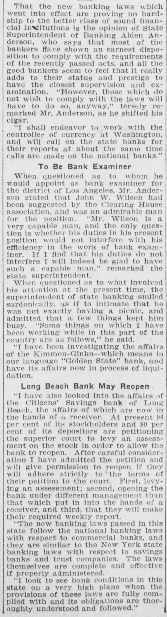 That the new banking laws which went into effect are proving no hardship to the better class of sound financial institutions is the opinion of State Superintendent of Banking Alden Anderson, who says that most of the bankers have shown an earnest disposition to comply with the requirements of the recently passed acts, and all the good bankers seem to feel that it really adds to their status and prestige to have the closest supervision and examination. "However, those which do not wish to comply with the laws will have to do so, anyway," tersely remarked Mr. Anderson, as he shifted his cigar. "I shall endeavor to work with the controller of currency at Washington, and will call on the state banks for their reports at about the same time calls are made on the national banks." To Be Bank Examiner When questioned as to whom he would appoint as bank examiner for the district of Los Angeles, Mr. Anderson stated that John W. Wilson had been suggested by the Clearing House association, and was an admirable man for the position. "Mr. Wilson is a very capable man, and the only question is whether his duties in his present position would not interfere with his efficiency in the work of bank examiner. If I find that his duties do not interfere I will indeed be glad to have such a capable man," remarked the state superintendent. When questioned as to what involved his attention at the present time, the superintendent of state banking smiled sardonically, as if to intimate that he was not exactly having a picnic, and admitted that a few things kept him busy. "Some things on which I have been working while in this part of the country are as follows," he said. "I have been investigating the affairs of the Kimmon-Ginko-which means in our language "Golden State" bank, and have its affairs now in process of liquidation. Long Beach Bank May Reopen "I have also looked into the affairs of the Citizens' Savings bank of Long Beach, the affairs of which are now in the hands of a receiver. At present 94 per cent of its stockholders and 80 per cent of its depositors are petitioning the superior court to levy an assessment on the stock in order to allow the bank to reopen. After careful consideration I have admitted the petition and will give permission to reopen if they will adhere strictly to the terms of their petition to the court. First, levying an assessment; second, opening the bank under different management than that which put in into the hands of a receiver, and third, that they will make their required weekly report. "The new banking laws passed in this state follow the national banking laws with respect to commercial banks, and they are similar to the New York state banking laws with respect to savings banks and trust companies, The laws themselves are complete and effective if properly administered. "I look to see bank conditions in this state on a very high plane when the provisions of these laws are fully complied with and its obligations are thoroughly understood and followed."