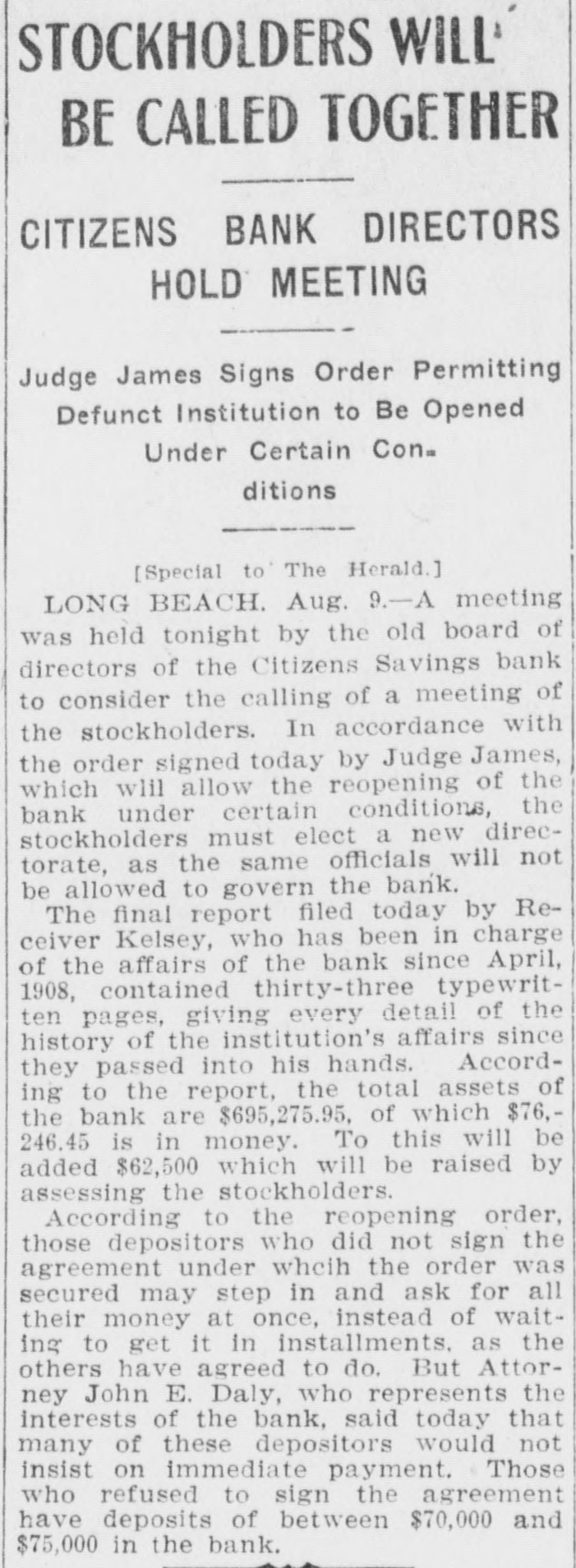 STOCKHOLDERS WILL BE CALLED TOGETHER CITIZENS BANK DIRECTORS HOLD MEETING Judge James Signs Order Permitting Defunct Institution to Be Opened Under Certain Con. ditions [Special to The Herald.] LONG BEACH. Aug. 9.-A meeting was held tonight by the old board of directors of the Citizens Savings bank to consider the calling of a meeting of the stockholders. In accordance with the order signed today by Judge James, which wlil allow the reopening of the bank under certain conditions, the stockholders must elect a new directorate, as the same officials will not be allowed to govern the bank. The final report filed today by Receiver Kelsey, who has been in charge of the affairs of the bank since April, 1908, contained thirty-three typewritten pages, giving every detail of the history of the institution's affairs since they passed into his hands. According to the report, the total assets of the bank are $695,275.95. of which $76,246.45 is in money. To this will be added $62,500 which will be raised by assessing the stockholders. According to the reopening order, those depositors who did not sign the agreement under wheih the order was secured may step in and ask for all their money at once, instead of waiting to get it in installments. as the others have agreed to do. But Attorney John E. Daly, who represents the interests of the bank, said today that many of these depositors would not insist on immediate payment. Those who refused to sign the agreement have deposits of between $70,000 and $75,000 in the bank.