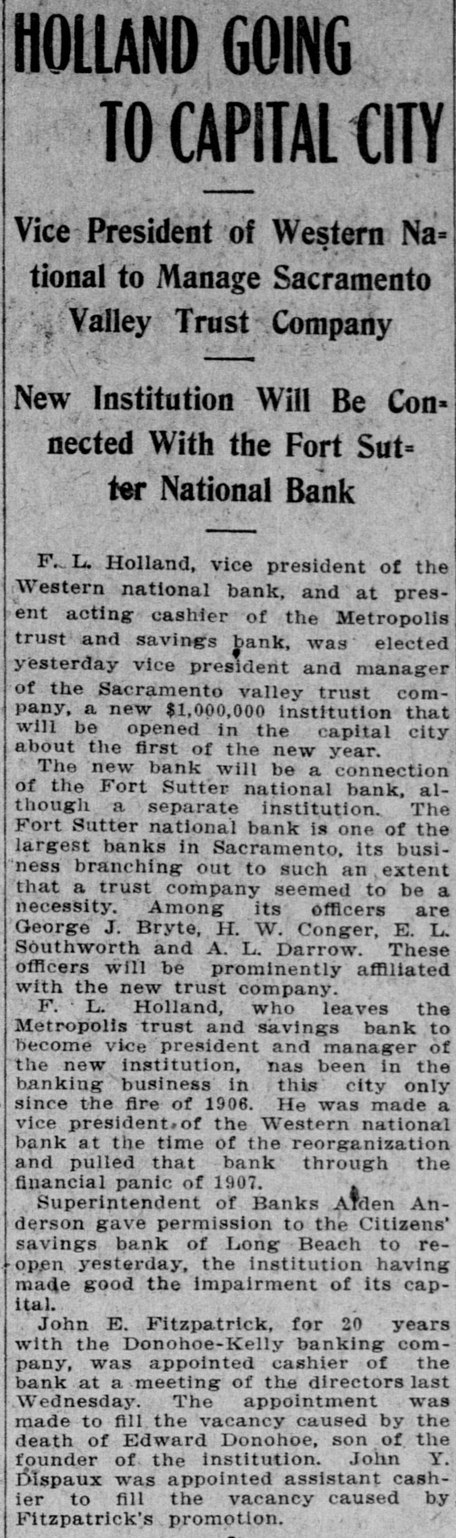 HOLLAND GOING TO CAPITAL CITY Vice President of Western Na= tional to Manage Sacramento Valley Trust Company New Institution Will Be Con= nected With the Fort Sut= ter National Bank F. L. Holland, vice president of the Western national bank, and at present acting cashier of the Metropolis trust and savings bank, was elected yesterday vice president and manager of the Sacramento valley trust company, a new $1,000,000 institution that will be opened in the capital city about the first of the new year. The new bank will be of national ala though the Fort separate Sutter institution. a connection bank, The Fort Sutter national bank is one of the largest banks in Sacramento, its business branching out to such an extent that a trust company seemed to be a its are H. W. L. George necessity. J. Bryte, Among Conger, officers E. Southworth and A. L. Darrow. These officers will be prominently affiliated with the new trust company. F. L. Holland, who leaves the Metropolis trust and savings bank to become vice president and manager of the new institution, nas been in the banking business in this city only since the fire of 1906. He was made a vice president, of the Western national bank at the time of the reorganization and pulled that bank through the financial panic of 1907. Superintendent of Banks Alden Anderson gave permission to the Citizens' savings bank of Long Beach to reopen yesterday, the institution having made good the impairment of its capital. John E. Fitzpatrick, for 20 years with the Donohoe-Kelly banking company, was appointed cashier of the bank at a meeting of the directors last Wednesday. The appointment was made to fill the vacancy caused by the death of Edward Donohoe, son of the founder of the institution. John Y. Dispaux was appointed assistant cashier to fill the vacancy caused by Fitzpatrick's promotion.