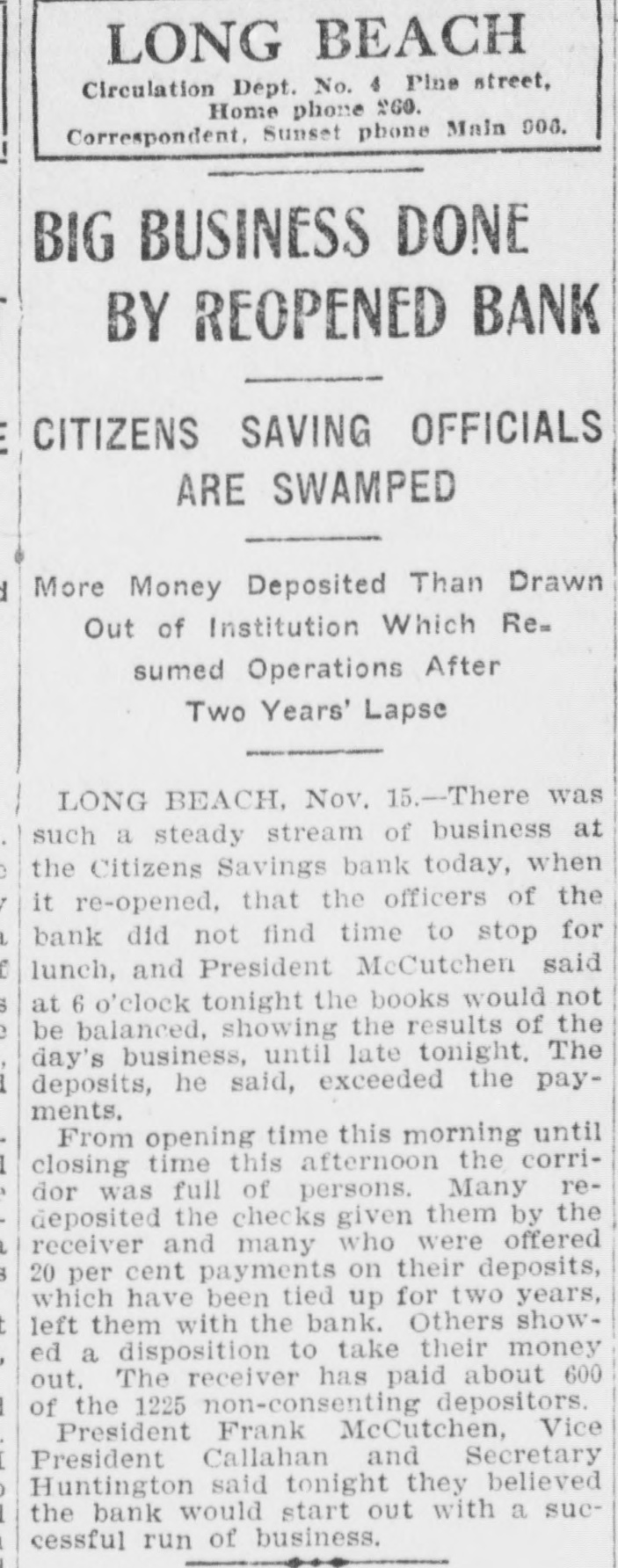 LONG BEACH Circulation Dept. No. 4 Plue street, Home phone 260. Correspondent Sunset phone Main 006. BIG BUSINESS DONE BY REOPENED BANK CITIZENS SAVING OFFICIALS ARE SWAMPED More Money Deposited Than Drawn Out of Institution Which Re= sumed Operations After Two Years' Lapse LONG BEACH, Nov. 15.-There was such a steady stream of business at the Citizens Savings bank today, when it re-opened, that the officers of the bank did not find time to stop for lunch, and President McCutchen said at 6 o'clock tonight the books would not be balanced, showing the results of the day's business, until late tonight. The deposits, he said, exceeded the payments, From opening time this morning until closing time this afternoon the corridor was full of persons. Many redeposited the checks given them by the receiver and many who were offered 20 per cent payments on their deposits, which have been tied up for two years, left them with the bank. Others showed a disposition to take their money out. The receiver has paid about 600 of the 1225 non-consenting depositors. President Frank McCutchen, Vice President Callahan and Secretary Huntington said tonight they believed the bank would start out with a successful run of business.