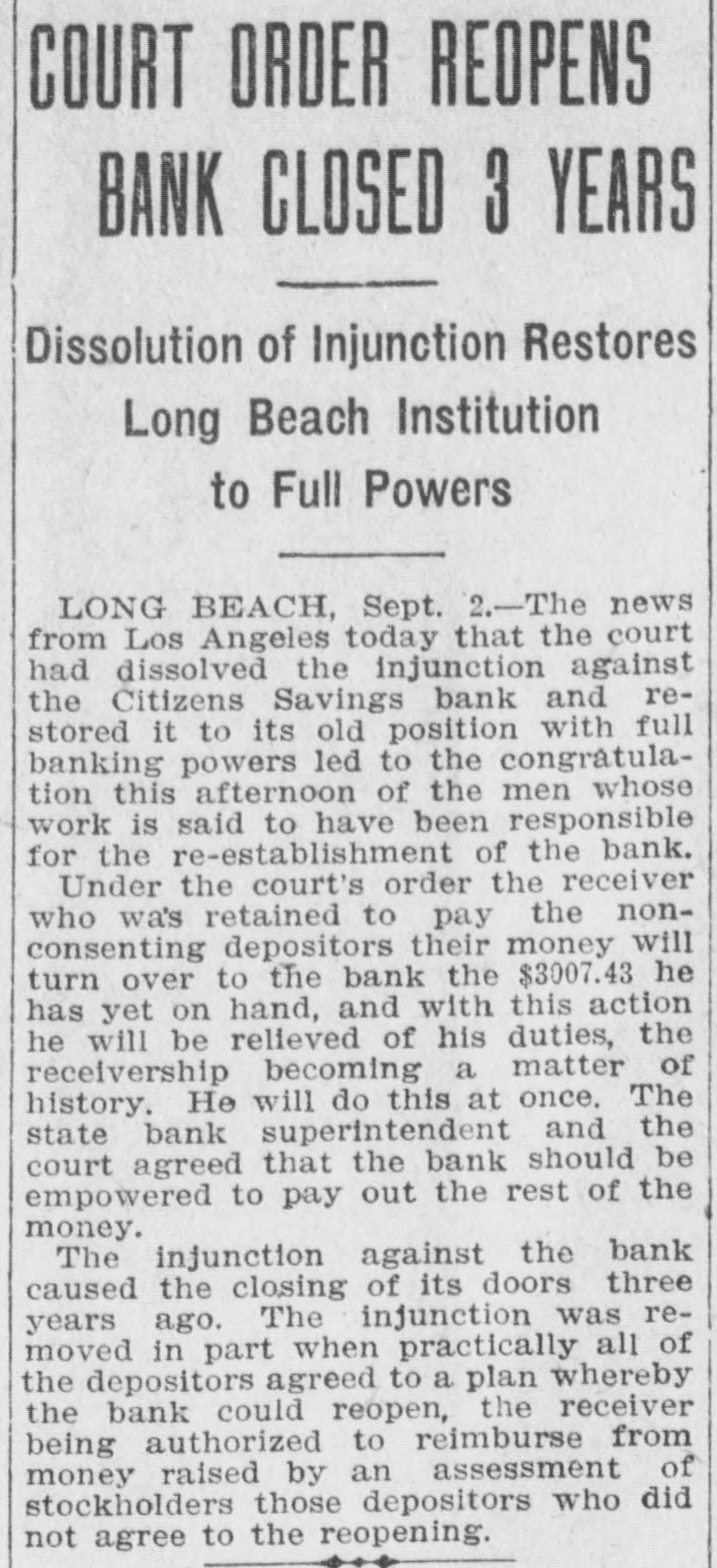 COURT ORDER REOPENS BANK CLOSED 3 YEARS Dissolution of Injunction Restores Long Beach Institution to Full Powers LONG BEACH, Sept. 2.-The news from Los Angeles today that the court had dissolved the injunction against the Citizens Savings bank and restored it to its old position with full banking powers led to the congratulation this afternoon of the men whose work is said to have been responsible for the re-establishment of the bank. Under the court's order the receiver who wa's retained to pay the nonconsenting depositors their money will turn over to the bank the $3007.43 he has yet on hand, and with this action he will be relieved of his duties, the receivership becoming a matter of history. He will do this at once, The state bank superintendent and the court agreed that the bank should be empowered to pay out the rest of the money. The injunction against the bank caused the closing of its doors three years ago. The injunction was removed in part when practically all of the depositors agreed to a plan whereby the bank could reopen, the receiver being authorized to reimburse from money raised by an assessment of stockholders those depositors who did not agree to the reopening.