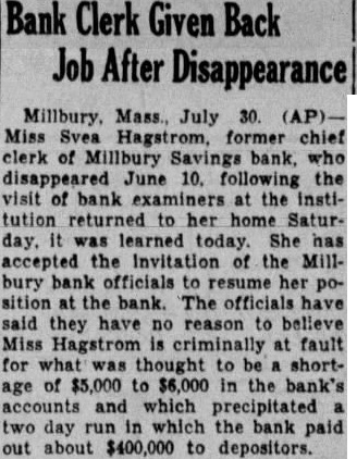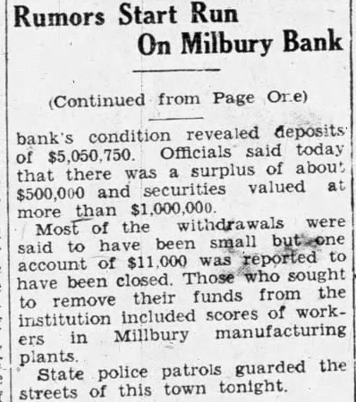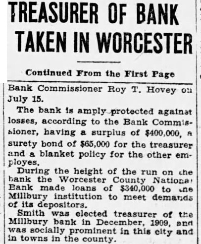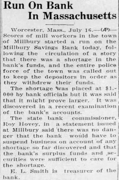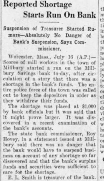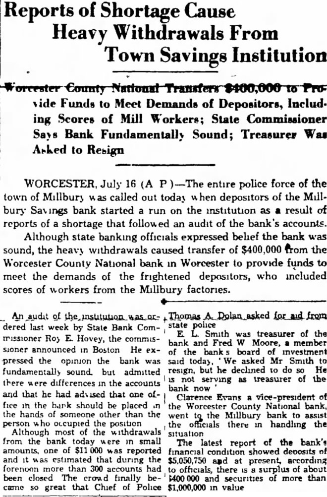 Reports of Shortage Cause Heavy Withdrawals From Town Savings Institution County National Transfers $400,000 to vide Funds to Meet Demands of Depositors, Including Scores of Mill Workers; State Commissioner Says Bank Fundamentally Sound; Treasurer Was Asked to Resign WORCESTER, July 16 entire police force of the town of Millbury was called out today when depositors of the Millbury bank started a run on the institution as a result of reports of a shortage that follow an audit of the bank's accounts. Although state banking officials expressed behef the bank was sound, the heavy withdrawals caused transfer of $400,000 from the Worcester County National bank in Worcester to provide funds to meet the demands of the frightened depositors, who included scores of workers from the Millbury factories. An audit of dered last week by State Bank Commissioner Roy E. Hovey, the commissioner announced in Boston He pressed the opinion the bank fundamentally but admitted there were differences in the accounts and that he had that one office in the bank should be placed the hands someone other than the person occupied the position Although most of the withdrawals from the bank today in small amounts, one of reported and it was estimated that during the forenoon more than 300 accounts had been closed The finally came so great that Chief of Police Thomas Dolan for from state police Smith was treasurer of the bank and Fred W Moore, member the bank board investment said today, We asked Mr Smith resign, but he declined do He serving as treasurer of the bank now Clarence Evans of the County National bank, went to the Millbury bank assist the officials there in handling the situation The latest report of the bank's financial condition showed deposits $5,050,750 and at present, according officials, there surplus about $400 000 and securities of more than $1,000,000 in value
