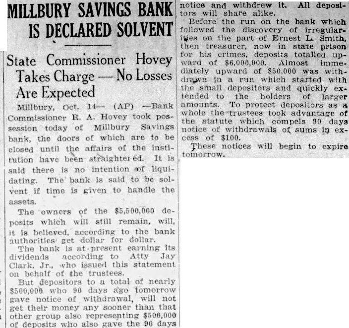 Millbury, Oct. 14- (AP) -Bank Commissioner R. A. Hovey took possession today of Millbury Savings bank, the doors of which are to be closed until the affairs of the institution have been straighter-ed It is said there is no intention of liquidating. The bank is said to be solvent if time is given to handle the assets. The owners of the $5,500,000 deposits which will still remain, will, it is believed, according to the bank get dollar for dollar. The bank at earning its dividends according to Atty Jay Clark, Jr., who issued this statement on behalf of the trustees. But depositors to total of nearly $500,000 who 90 days ago tomorrow gave notice of withdrawal, will not get their money any sooner than that other group also representing $500,000 of deposits who also gave the 90 days notice and withdrew it. All depositors share alike. Before the run on the bank which followed the discovery of irregularitles on the part of Ernest L. Smith, then treasurer, now in state prison for his crimes, deposits totalled upward of $6,000,000. Almost immediately upward of $50.000 was withdrawn in a run which started with the small depositors and quickly extended to the holders of larger amounts. To depositors as a whole the trustees took advantage of the statute which compels 90 days notice of withdrawals of sums in excess of $100. These notices will begin to expire tomorrow.