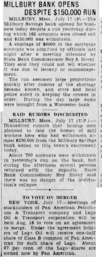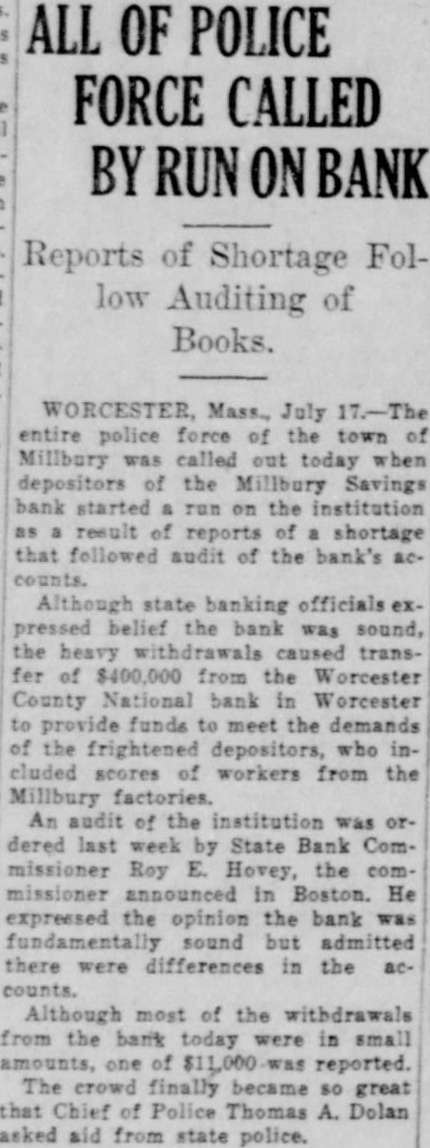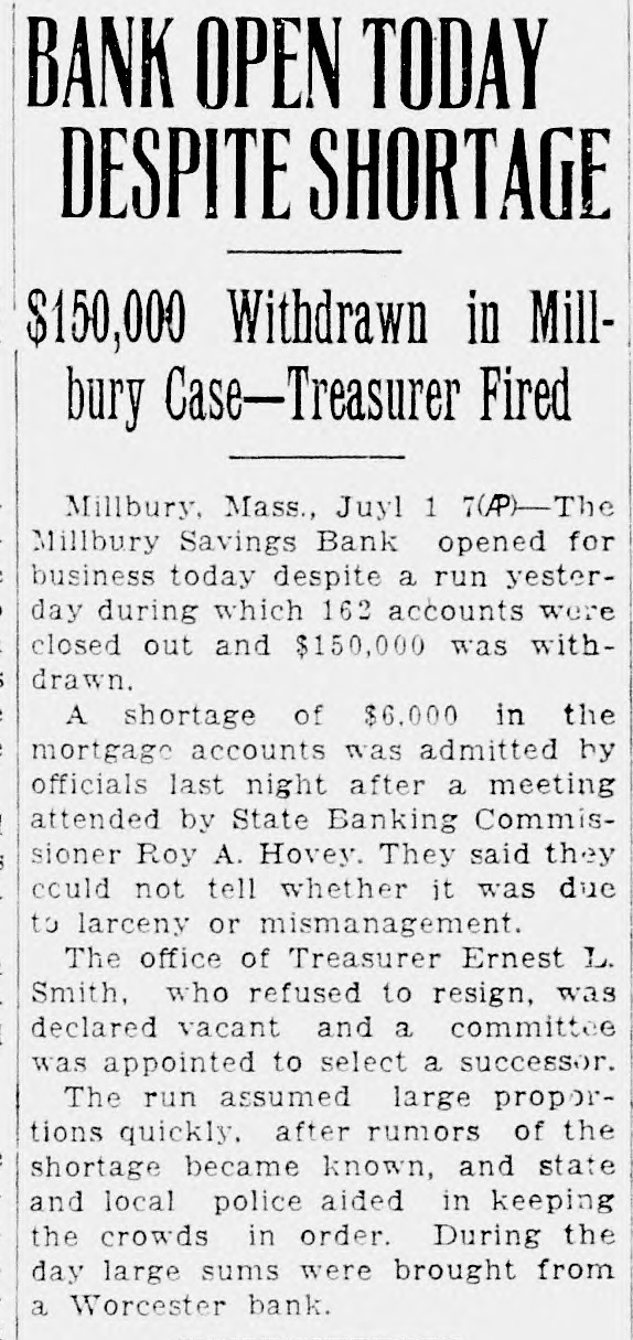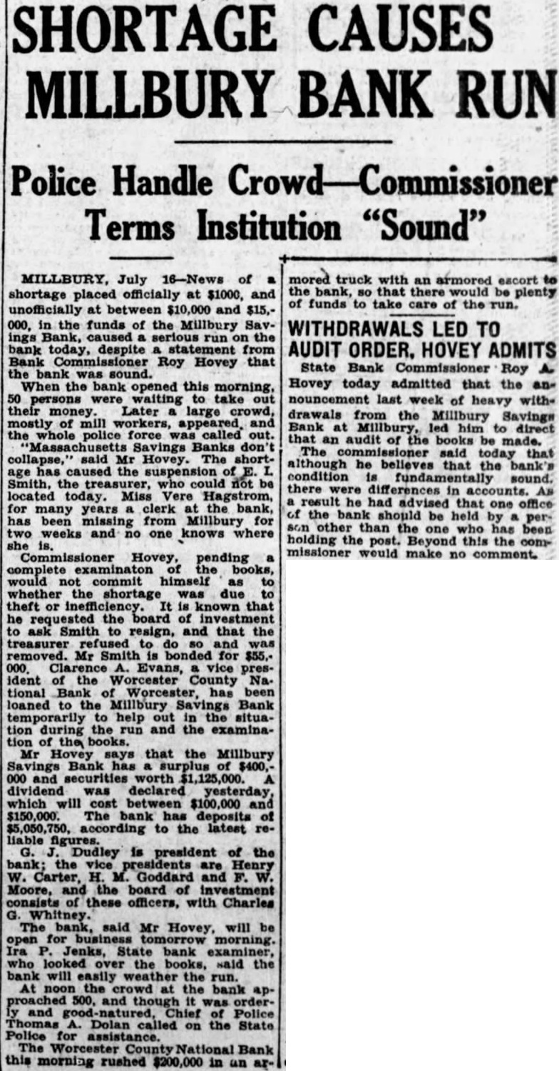 MILLBURY, July 16-News of shortage placed officially at $1000, and unofficially at between $10,000 and $15, 000, in the funds of the Millbury Savings Bank, caused serious on the bank today, despite statement from Bank Roy Hovey that the bank sound. When the bank opened this morning, 50 persons were waiting to take out their money. Later large crowd, mostly of mill workers, appeared and the whole police force called out. Savings Banks don't collapse, said Mr Hovey. The shortage has caused the suspension Smith, the treasurer, could not be located today. Miss Vere Hagstrom, for many years clerk the bank, has been missing from Millbury for two weeks and no one knows where she is. Commissioner Hovey, pending complete examinaton of the books, would not commit himself as whether the shortage was due theft or inefficiency is known that he requested the board of investment to ask Smith to resign, and that the treasurer refused to and removed. Mr Smith is bonded for $55,Evans, vice president of the Worcester County Na. tional of Worcester, has been loaned to the Millbury Savings Bank temporarily to help out in the situation during the run and the examination of books. Mr Hovey says that the Millbury Savings Bank surplus of $400,000 and securities worth $1,125,000. A dividend was declared yesterday, which will cost between $100,000 and $150,000. The bank has deposits $5,050,750. according to the latest reliable G. Dudley is president of the bank; the vice presidents are Henry W. Carter, H. M. Goddard and F. W. Moore, and the board of investment consists of these officers, with Charles G. Whitney. The bank, said Mr Hovey, will be open for business morning. Ira P. Jenks, State bank examiner, who looked over the books, said the bank will easily weather run. At noon the crowd at the bank ap500, and though was orderand Chief Police Police Thomas Dolan called on the State for assistance. The County Bank this morning rushed $200,000 in an ar- mored truck with an armored escort to the bank, that there would be plenty of funds to take care of the run,