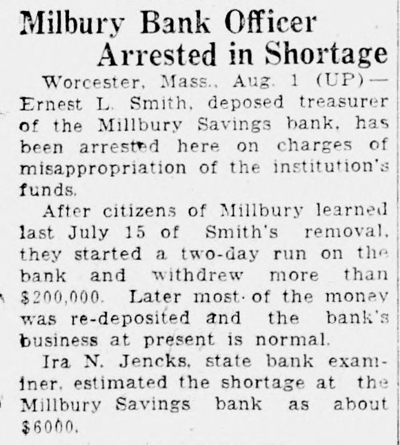 Milbury Bank Officer Arrested in Shortage Worcester, Mass. Aug. 1 (UP) Ernest L Smith, deposed treasurer of the Millbury Savings bank. has been arrested here on charges of misappropriation of the institution's funds. After citizens of Millbury learned last July 15 of Smith's removal, they started a two-day run on the bank and withdrew more than $200,000. Later most of the money was re-deposited and the bank's business at present is normal. Ira N. Jencks. state bank examiner. estimated the shortage at the Millbury Savings bank as about $6000.