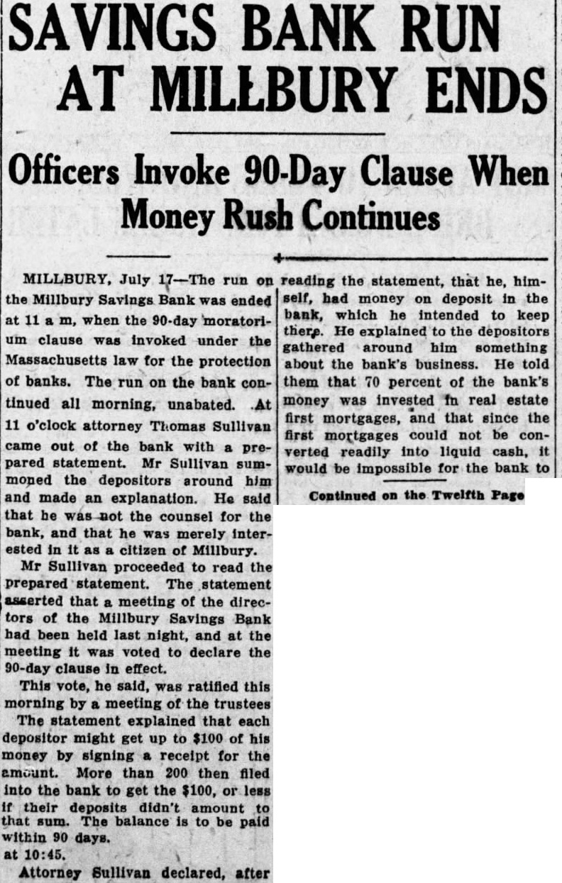 11 o'clock attorney Thomas Sullivan came out of the bank with a prepared statement. Mr Sullivan summoned the depositors around him and made an explanation. He said that he was not the counsel for the bank, and that he was merely interested in it as a citizen of Millbury. Mr Sullivan proceeded to read the prepared statement. The statement asserted that a meeting of the directors of the Millbury Savings Bank had been held last night, and at the meeting It was voted to declare the 90-day clause in effect. This vote, he said, was ratified this morning by a meeting of the trustees The statement explained that each depositor might get up to $100 of his money by signing a receipt for the amount. More than 200 then filed into the bank to get the $100, or less if their deposits didn't amount to that sum. The balance is to be paid within 90 days. at 10:45. Attorney Sullivan declared, after reading the statement, that he, himself, had money on deposit in the bank, which he intended to keep there. He explained to the depositors gathered around him something about the bank's business. He told them that 70 percent of the bank's money was invested fn real estate first mortgages, and that since the first mortgages could not be converted readily into liquid cash, it would be impossible for the bank to
