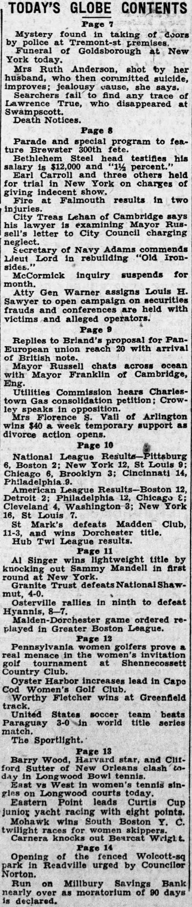 Page 8 Parade and special program to feature Brewster 300th fete. Bethlehem Steel head testifies his salary is $12,000 and "1½ percent. Earl Carroll and three others held for trial in New York on charges of giving Fire at Falmouth results in two injuries. City Treas Lehan of Cambridge says his Russell's letter to City Council charging neglect. Secretary of Navy Adams commends Lieut Lord in rebuilding "Old Ironsides. McCormick inquiry suspends for month. Atty Gen Warner assigns Louis H. Sawyer to open campaign on securities frauds and conferences are held with victims and alleged operators. Page