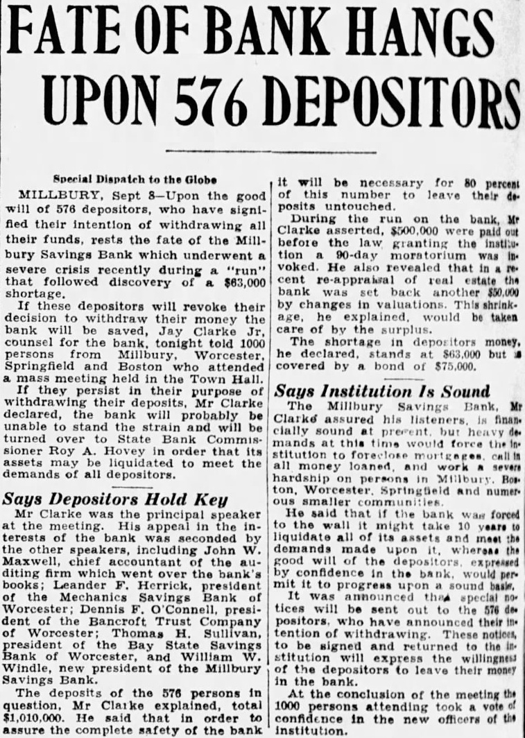 Special Dispatch to the Globe Sept the good will of 576 depositors, who have signified their intention of all their funds, rests the fate of the Millbury Savings Bank which underwent a severe crisis recently during "run" that followed discovery $63,000 If these depositors will revoke their decision to withdraw their money the bank will saved, Jay Clarke counsel for the bank. tonight told 1000 persons from Millbury, Springfield and Boston who attended mass held in the Town Hall. If they persist in their purpose of withdrawing their deposits, Mr Clarke declared, the bank will probably be unable to stand the strain and will be turned over State Bank Commissioner Roy Hovey order that assets may be liquidated to meet the demands of all depositors.