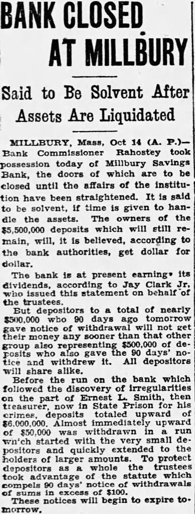 MILLBURY, Mass, Oct 14 (A. Rahostey took Bank today of Millbury Savings Bank, the doors of which are to be closed until the affairs of the institution have been straightened. It is said to be solvent, if time is given to handle the assets. The owners of the 5,500,000 deposits which will still remain, will, it is believed, according to the bank authorities, get dollar for dollar. The bank is at present earning* its dividends, to Jay Clark who issued this on behalf of the depositors to a total of nearly $500,000 who days tomorrow notice of withdrawal will not get their gave money any sooner that other also representing $500,000 of group who days' tice and withdrew it. All depositors will share alike. Before the run on the bank which followed the discovery of irregularities the of Ernest Smith, then part treasurer in State Prison for his crimes, deposits totaled Almost immediatel upward of $50,000 withdrawn in run which started with the very quickly to the positors and holders of larger To protect depositors whole the trustees took advantage of the statute which compels 90 days' $100. withdrawals These notices will begin to expire to. morrow.