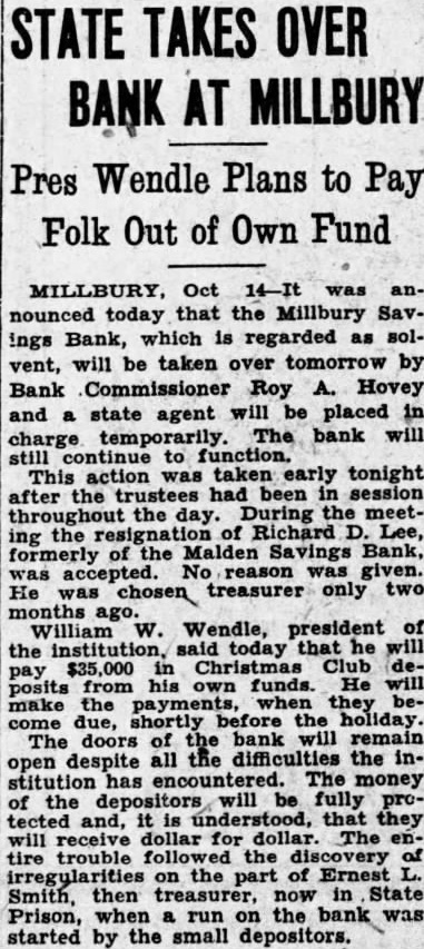 MILLBURY, Oct 14-It was nounced today that the Millbury Savings Bank, which is regarded as solvent, will be taken by Bank Commissioner Roy A. Hovey and state agent will be placed in charge temporarily. The bank will still continue to action was taken early tonight after the had been in session the day. During the meetthe resignation of Richard D. Lee, formerly ing of the Malden Savings Bank, accepted. reason given. He was treasurer only two ago. William W. Wendle, president of the institution, today that he will pay $35,000 Christmas Club will posits from his own funds. He make the payments, when they come due, shortly before the holiday The doors of the bank will remain open despite all the difficulties the institution has The money of the be fully tected and, that they will receive dollar for dollar. The tire trouble followed the discovery irregularities on the of Ernest Smith, then treasurer, now in State Prison, when run on the bank was started by the small depositors.