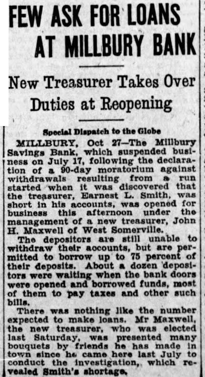 Special Dispatch to Globe MILLBURY, Oct 27-The Millbury Savings Bank, which suspended business on July 17, following the declaration of a 90-day moratorium against withdra resulting from run started when it was discovered that the treasurer, Earnest L. Smith, was short in his accounts, was opened for business this afternoon under the nanagement of a new treasurer, John H. Maxwell of West Somerville. The depositors are still unable to withdraw their accounts, but are permitted to borrow up to 75 percent of their deposits. About dozen depositors were when the bank doors and borrowe funds, most of them to pay taxes and other such bills. There was nothing like the number expected to make loans. Mr Maxwell, the who was elected last Saturday, was many bouquets by friends he has made town since he came here last July to conduct the investigation, which revealed Smith's shortage.