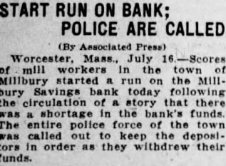 (By Associated Press) Mass., July workers in the town of Millbury started run the Millbury Savings bank today following circulation of story that there shortage in the bank's funds. The entire police force of the town called out keep the deposiorder as they withdrew their funds.