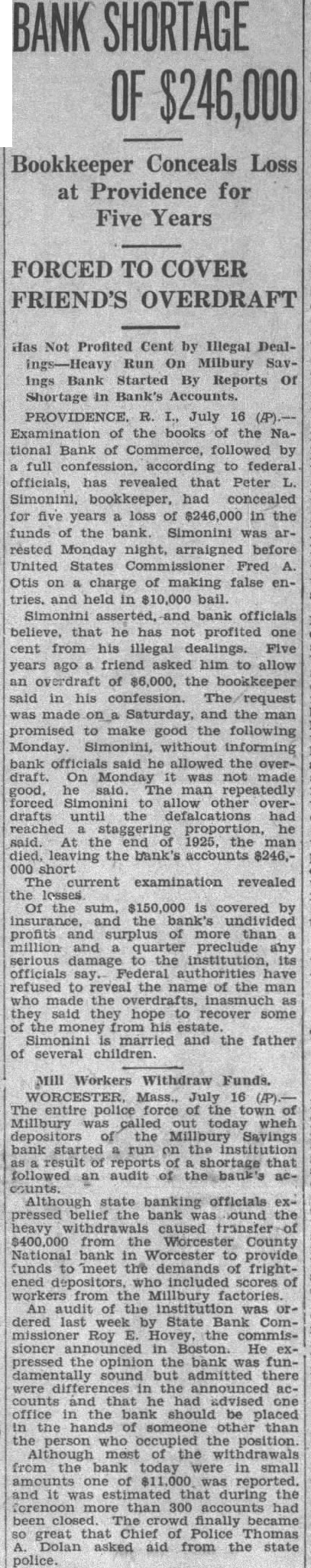 Has Not Profited Cent by Illegal Dealings-Heavy Run On Milbury SavBank Started Reports Of Bank's PROVIDENCE. July 16 Examination the books of the National Bank of by full to federal officials, has revealed that Peter Simonini, bookkeeper, concealed for five years of $246,000 in the funds the bank. Simonini arrested Monday night, before United Fred Otis charge of making false entries. and held in officials believe. that he has not profited cent his illegal Five years ago to allow an $6,000, hookkeeper said in made Saturday, the man promised make the following Monday. Simonini, without informing bank said he allowed the overdraft. On Monday made repeatedly forced drafts had proportion, said. the bank's $246,000 short The current examination revealed the losses covered by and the profits than million preclude any serious the institution, officials authorities have refused reveal the name of the man the hope recover some and the father several