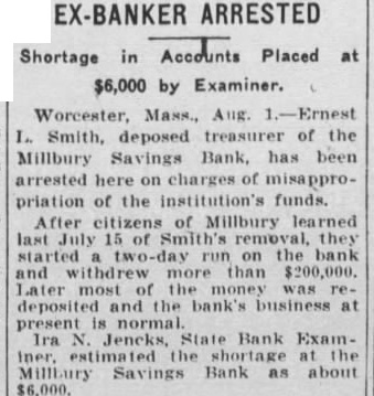 Worcester, Mass., Aug. 1.-Ernest L. Smith, deposed treasurer of the Millbury Savings Bank, has been arrested here on charges of misappropriation of the institution's funds. After citizens of Millbury learned last July 15 of Smith's removal, they started two-day run on the bank and withdrew more than $200,000. Later of the was redeposited and the bank's business at present is normal. Ira N. Jencks, State Bank ExamIner. estimated the shortage the Millbury Savings Bank as about $6,000.