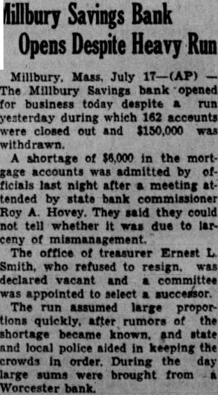 Millbury, Mass. July 17-(AP) The Millbury Savings bank opened for business today despite a run yesterday during which 162 accounts were closed out and $150,000 was withdrawn. A shortage of $6,000 in the mortgage accounts was admitted by of ficials last night after meeting attended by state bank commissioner Roy A. Hovey. They said they could not tell whether it was due to larceny of The office of treasurer Ernest L. Smith, who refused to resign, was declared vacant and a committee was appointed to select successor. The run assumed large proportions quickly, after rumors of the shortage became known. and state and local police aided in keeping the crowds in order. During the day large sums were brought from Worcester bank.