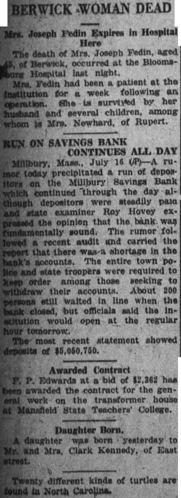 The death of Mrs. Joseph Fedin, aged of Berwick, occurred at the BloomsHospital last night. Mrs. Fedin had been patient at the Institution for a week following an operation. She is surviyed by her husband and several children, among whom is Mrs. Newhard, of Rupert.