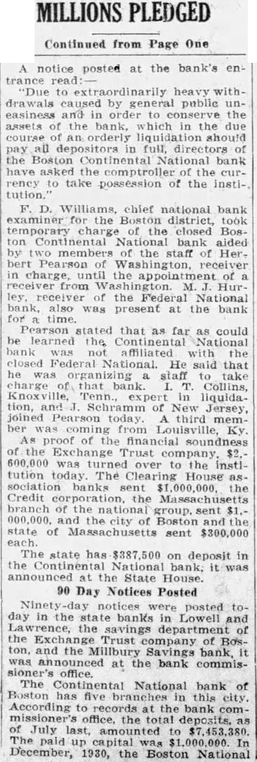 Williams, chief bank examiner temporary charge closed aided Her receiver the Federal bank, was present the bank Pearson that as far could learned National affiliated closed He said that he staff that Schramm Jersey, mem Trust was the tution today The Clearing House banks sent Credit corporation. the branch of the national group. sent of sent $300,000 on deposit in the National it the State House. 90 Day Notices Posted posted today the banks in Lowell the savings department of the Trust company and the Millbury Savings bank, at the bank commisThe National bank of five city According the bank commissioner's the July last, amounted to The paid capital December, 1930, the Boston National