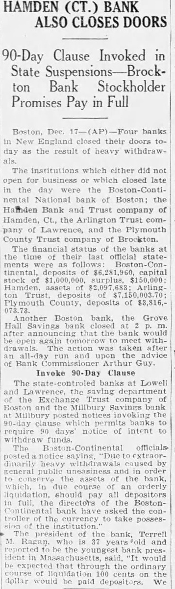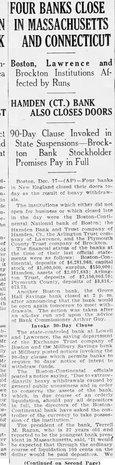 The institutions which either did not open for business which closed the day the nental National bank of Boston: the Hamden Bank and Trust of Hamden, company and County Trust financial status the banks at The the time their last official statements capital tinental, stock surplus, assets ArlingTrust deposits County, deposits of $3,816,Boston the Grove Another Hall Savings closed the bank would again meet action was taken after all-day and upon Arthur Guy. Bank Invoke Clause bank at Lowell The the department Trust company Boston the Millbury Savings bank the Millbury banks 90-day clause notice of intent require funds. The officials withdrawals caused dinarily heavy uneasiness and order general public conserve the assets of the bank. which. in course orderly liquidation, should pay all full, the Bostonbank the troller currency to take possesthe The president the bank, Terrell M. Ragan, 37 years old and reported the youngest president in said, would expected that through the ordinary cents on dollar would be paid depositors. We