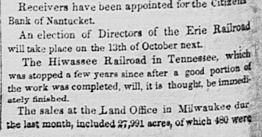 Receivers have been appointed for the Citizens Bank of Nantucket. An election of Directors of the Erie Railroad will take place on the 13th of October next. The Hiwassee Railroad in Tennessee, which was stopped a few years since after a good portion of the work was completed, will, it is thought, be immediately finished. The sales at the Land Office in Milwaukee during the last month, included 27,991 acres, of which 480 were