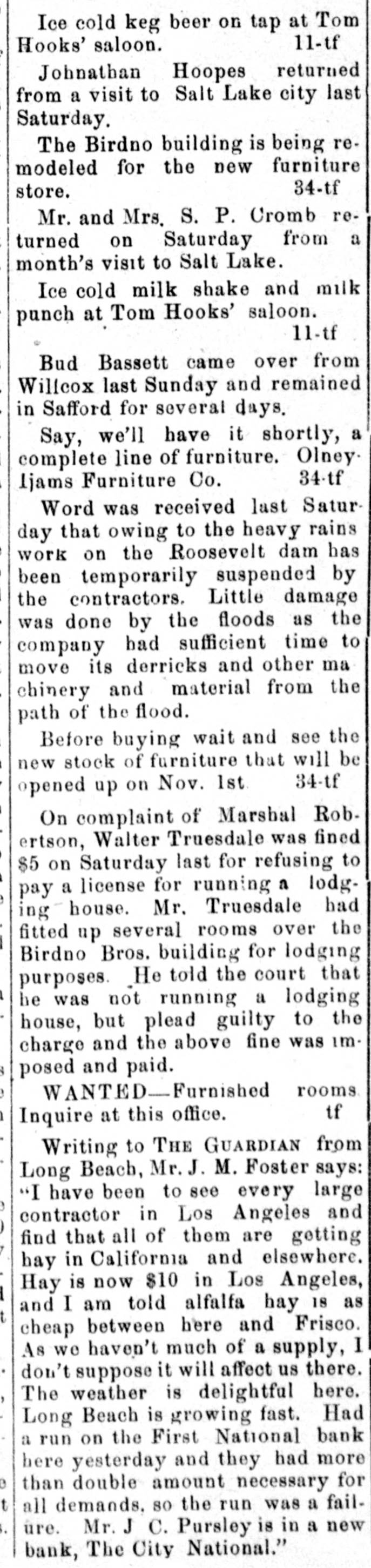 Ice cold keg beer on tap at Tom 11-tf Hooks' saloon. Johnathan Hoopes returned from a visit to Salt Lake city last Saturday. The Birdno building is being remodeled for the new furniture 34-tf store. Mr. and Mrs. S. P. Cromb returned on Saturday from a month's visit to Salt Lake. Ice cold milk shake and milk punch at Tom Hooks' saloon. 11-tf Bud Bassett came over from Willcox last Sunday and remained in Safford for several days. Say, we'll have it shortly, a complete line of furniture. Olney. 34-tf ljams Furniture Co. Word was received last Saturday that owing to the heavy rains work on the Roosevelt dam has been temporarily suspended by the contractors. Little damage was done by the floods as the company had sufficient time to move its derricks and other ma chinery and material from the path of the flood. Before buying wait and see the new stock of furniture that will be 34-tf opened up on Nov. 1st On complaint of Marsbal Robertson, Walter Truesdale was fined $5 on Saturday last for refusing to pay a license for running a lodging house. Mr. Truesdale had fitted up several rooms over the Birdno Bros. building for lodging purposes. He told the court that he was not running a lodging house, but plead guilty to the charge and the above fine was im. posed and paid. WANTED-Furnished rooms if Inquire at this office. Writing to THE GUARDIAN from Long Beach, Mr. J. M. Foster says: "I have been to see every large contractor in Los Angeles and find that all of them are getting hay in California and elsewhere. Hay is now $10 in Los Angeles, and I am told alfalfa hay 18 as cheap between here and Frisco. As we haven't much of a supply, I don't suppose it will affect us there. The weather is delightful here. Long Beach is growing fast. Had a run on the First National bank here yesterday and they had more than double amount necessary for all demands. so the run was a failure. Mr. J C. Pursley is in a new bank, The City National."