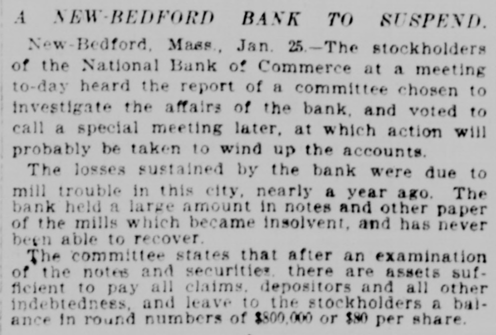 A NEW-BEDFORD BANK TO SUSPEND. New-Bedford, Mass. Jan. 25.-The stockholders of the National Bank of Commerce at a meeting to-day heard the report of a committee chosen to investigate the affairs of the bank. and voted to call a special meeting later. at which action will probably be taken to wind up the accounts. The losses sustained by the bank were due to mill trouble in this city, nearly a year ago. The bank held a large amount in notes and other paper of the mills which became insolvent, and has never been able to recover The committee states that after an examination of the notes and securities. there are assets sufficient to pay all claims. depositors and all other indebtedness, and leave to the stockholders a balance in round numbers of $800,000 or $80 per share.