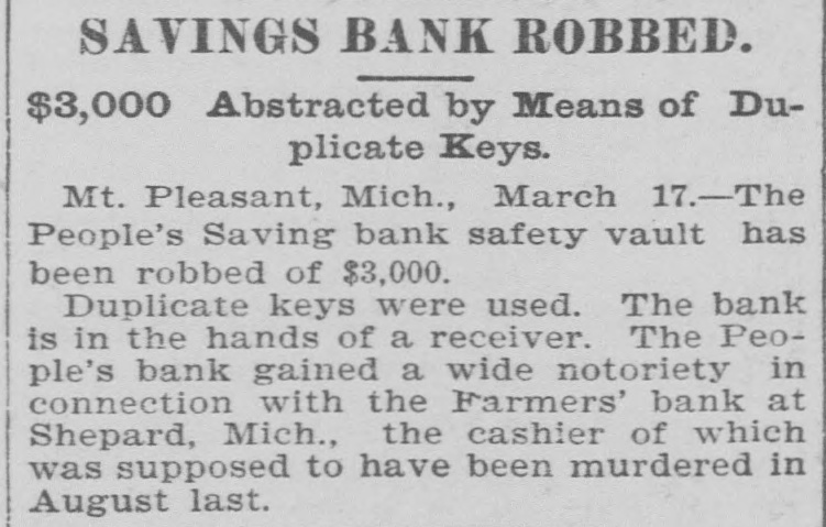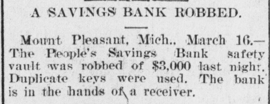 NEW YORK MINING STOCKS. Cholor $0 60 Ontario $3 00 Crown Point 53 15 Ophir Con. Cal. & Va 15 1 05 Plymouth Deadwood 1 00 95 Quicksilver 10 00 Gould & Curry 33 do pfd 50 Hale & Norcross. 90 Sierra Nevada Homestake 29 00 Standard 1 55 Iron Silver 32 30 Union Con. 28 Mexican 20 Yellow Jacket BOSTON MINING SHARES. 1 Allouez Min. Co Franklin 161/2 Atlantic 24 21 Kearsarge Boston & Mont Osceola 38 1437/8 118 Butte & Boston 275/8 Quincy Calumet & Hecla.415 Tamarack 135 Centennial 9 Wolverine 13 1/2 FOREIGN FINANCIAL. NEW YORK, Aug. 20.-Evening Post's London financial cablegram: The stock markets here were irregular today, with an improving tendency on the better news from India. Americans, however, closed flat in the street on the absence of New York support. Sales by recent purchasers here are not being pressed, but there will be no initiative for a rise until New York gives a fresh lead. The recovery in silver and silver stocks is regarded as comewhat artificial. Foreigners were better, a feature being the recovery in Brazils on improved exchange. Kaffirs were hard at the close, on reports in good quarters that Kruger is regarding the concessions more favorably. NEW YORK MONEY. NEW YORK, Aug. 20.-Money on call easy at 11/4@11/2 per cent; last loan, 11/4; close 11/4 per cent. Prime mercantile paper, 33/4@41/2 per cent. Sterling exchange, steady, with actual business in bankers' bills at $4.85% @4.853/4 for demand and at $4.831/@4.8334 for 60 days. Posted rates, $4.841/2@4.86, and $4.861/2@4.87. Commercial bills, $4.82. Silver certificates, 50@521/2c. Bar 523/c. silver, Mexican dollars, 401/2c. BRACE IN SILVER. NEW YORK, Aug. 20.-There was a sharp recovery in the price of silver today, bar silver opening in London at 241/2 pence, an advance of 7-16 of a penny. The opening price here for bar silver was 523/c, a rise of 3/4c. Mexican dollars were quoted this morning at 401/2c, against 397/80 yesterday. Yesterday's low level invited buying, which induced the recovery, but the market is reported rather weak at the rise. SAVINGS BANK SUSPENDS. MOUNT PLEASANT, Mich., Aug. 20.-The People's Savings bank, of this city, closed its doors this morning, and is now in the hands of the commissioner of banking. No statement has been given out. According to the last statement, made in January, the capital stock of the bank was $100,000, with $90,000 in deposits. George E. Newell is president, and C. A. Carnahan cashier. BANK CLEARINGS. St. Paul $669,812.84. Minneapolis, $1,157,268. Chicago, $14,845,336. New York. $98,897,744. Boston, $13,531,925. PRIVATE BANK FAILS. EUREKA, Utah., Aug. 20.-The private banking house of G. A. Rice has suspended payment on account of heavy withdrawals and inability to realize. The bank had on deposit about $30,000. CHICAGO MONEY. CHICAGO Aug. 20.-New York exchange, 40c discount. Sterling exchange, posted rates, $4.841/2 and $4.861/2. TREASURY STATEMENT. WASHINGTON. Aug. 20.-Today's statement of the condition of the treasury shows: Available cash, $220,915,183; gold reserve, $143,052,321.