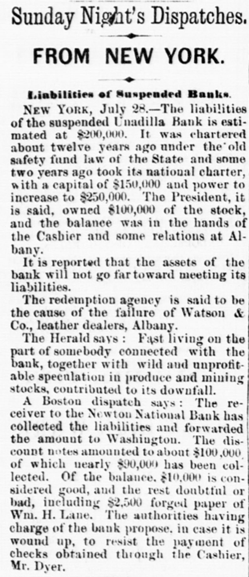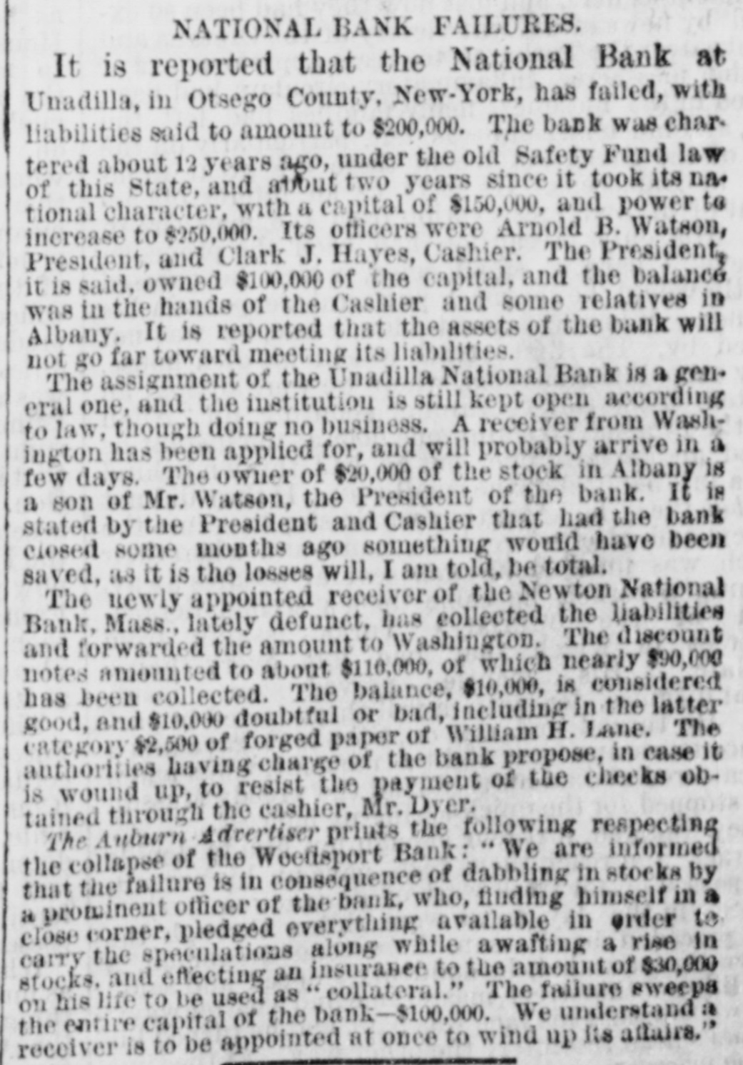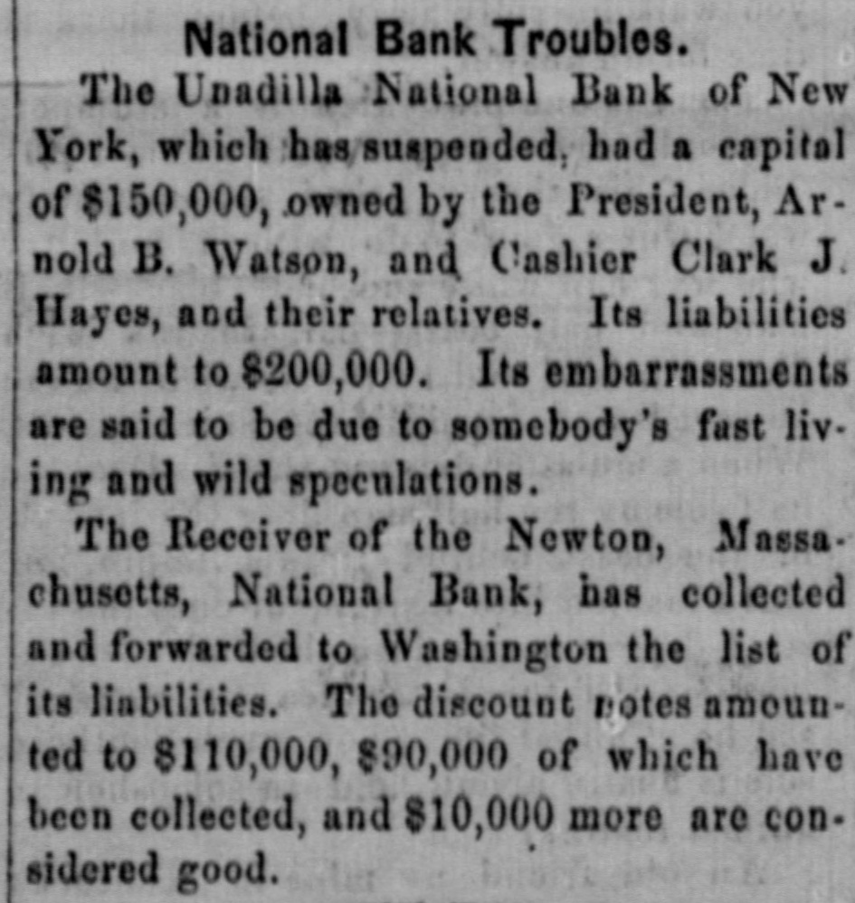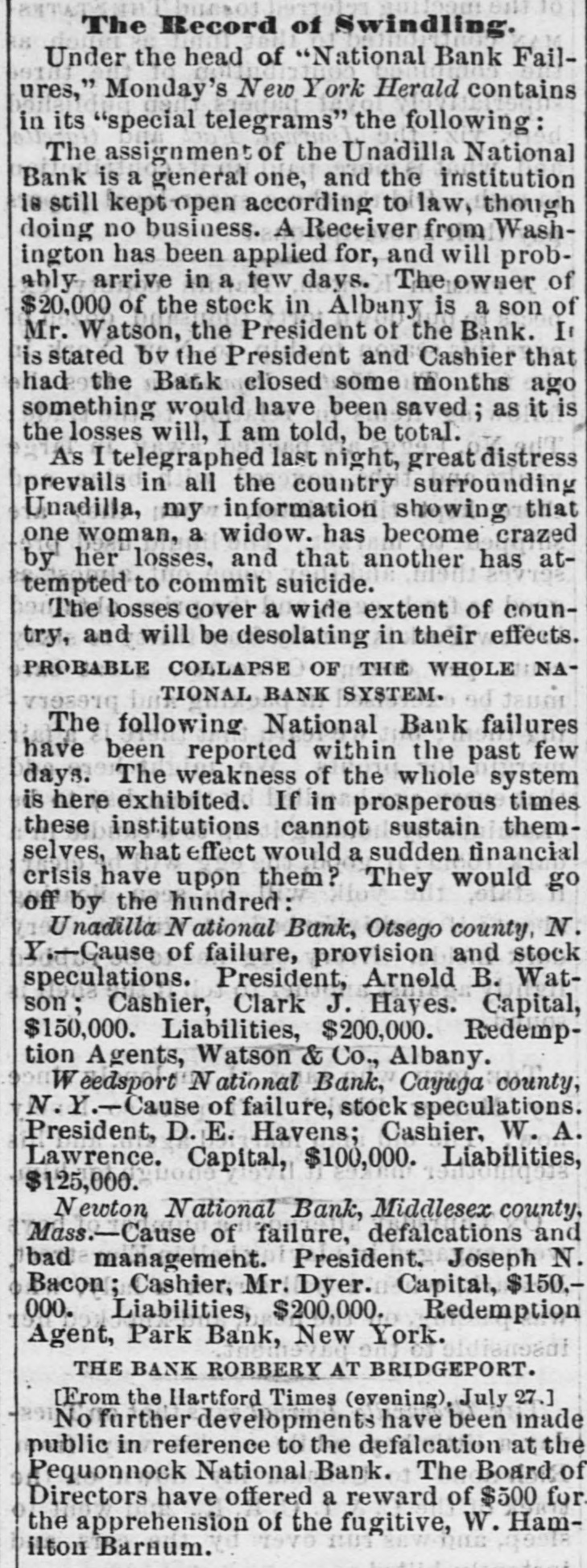 NATIONAL BANK TROUBLES. Reported Collapse of the Unadilla National Bank-Liabilities $200,000. A report reached the city yesterday that the National Bank at Unadilla, in Otsego county, liaNew York, had made a bad break, with bilities said to amount to $200,000. The bank was chartered about twelve years ago, under the old Safety Fund law of this State, and about two years since it took its national character, with a capital of $150,000, and power to increase to $250,000. Its officers were Arnold B. Watson, President and Clark J. Hayes, Cashier. The President, it is said, owned $100,000 of the capital, and the balance was in the hands of the Cashier and some relatives in Albany. will It is reported that the assets of the bank not go far towards meeting its liabilities. Fast living on the part of somebody connected with the institution, together with wild and unprofitable speculations in produce and mining stocks, contributed to its downfall. Its redemption agency is said to be the house of Watson & Co., leather dealers, of Albany. N. Y. Heraid. TROY, N. Y. July 27.-It appears upon trustworthy information that the management of the Unadilla National Bank has been of an exceedingly reckless character. The managers of the bank own a large majority of the stock, and it understood that they have lost it in extravagant mining and produce speculations. In doing this they have not only used up the capital of the bank, but have also taken the special deposits, at a very heavy rate of interest, from all the old farmers and other confiding people in the neighborhood. On these special deposits they have paid seven per cent. interest, while the usual interest upon such deposits ranges not to exceed five per cent., and oftentimes as low as four per cent also learn that many of the merchants in and around that neighborhood have been sending certific ates of deposit on this bank to pay their debts in New York, which, having been returned to the bank for New York funds, have remained in the hands of the Unadilla Bank unpaid. It 18 probable that the holders of these certificates will be compelled to await the action of the receiver, to be appointed, before the they can ascertain what proportion of assets they will receive as dividends. For some time the authorities of this bank have struggled to get back under the old State system, to the end that they might administer their affairs much more economically and with less popular suspicion. Of course the innocent people of that section of the country are in the highest state of alarm and indignation at the reckless acts of the bank officers. Corresponding banks throughout the country, which have sent the Unadilla items for collection, have in no instance received a response for some time past. Hence it has been found necessary to send special agents to Unadilla to ascertain the true status of affairs. It appears that the Government Examining Agent some time since paid the bank an official visit to ascertain its standing, and to learn it it was complying with the National Banking law. It is understood that the bank was then very deficient in the number of legal-tenders which the law required it to have on hand. This shows full well that the law can be violated at any time by all national bank officers. In the case of this failure, as in many other similar instances, it has been ascertained that the legaltender security to be kept in the bank for the benefit and safety of depositors has always been found missing when the receivers are appointed. The assets of the bank are very light compared with the liabilities. Defunct Newton (Mass.) National Bank. BOSTON, Mass., July 27. -The newly appointed receiver of the Newlon National Bank, lately defunct, has collected the liabilities and forwarded the amount to Washington. The discount notes amount to $ 110.000, of which a nearly $90,000 has been collected. The balance, f $10,000, is considered good, and $10,000 doubtfulor bad, including in the latter category $2500 a of forged paper of William H. Lane. The authorities having charge of the bank 0 propose, in case it is wound up, to resist the payment of the checks obtained through the cashier, Mr. Dyer. e d The Weedsport Bank Defalcation. The Auburn Advertiser prints the following e respecting the collapse of the Weedsport Bank:'We are informed that the failure is in conseo quence of dabbling in stocks by a prominent y officer of the bank. who, finding himself in a close corner, pledged everything available in le order to carry the speculations along while h awaiting a rise in stocks, and effecting an insuh rance to the amount of $30,000 on his life to be f used as 'collateral.' The failure sweeps the entire capital of the bank $100,000. We une derstand a receiver is to be appointed at once to is wind up its affairs." ts Additional Particulars of the Collapse of S the Unadilla National Bank. TROY, N. Y., July 28. The assignment of the Unadilla National Bank is a general one. and the institution is still kept open according y law. though doing no business. A receiver al from Washington has been applied for, and will a probably arrive in a few days. The owner of of $20,000 ot the stock in Albany is a son of Mr. Watson, the President of the bank. s tated or by the President and Cashier that had the bank al been closed some months ago, something would e. have been saved; as it is, the loss will, I am told, be total. ed I telegraphed last night, great distress prent vails in ali the country surrounding Unadilla. a he my information showing that one woman, nt widow, has become crazed by her losses, and that another has attempted to commit suicide. eir The losses cover a wide extent of country, and as will be desolating in their effects. Probable Collapse of the Whole National he Bank System. ny The following National Bank failures have ny been reported within the past few days. The weakness of the whole system is here exhibited. hip If in piosperous times these institutions c