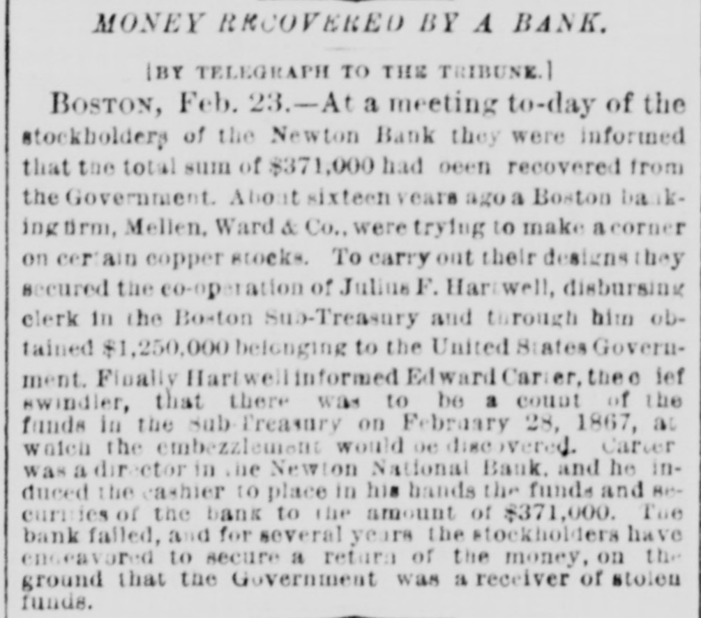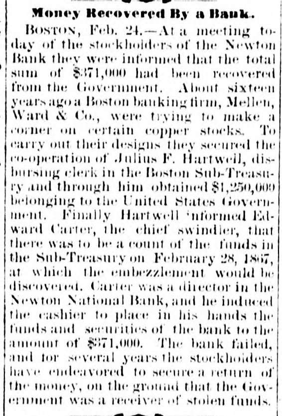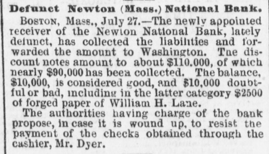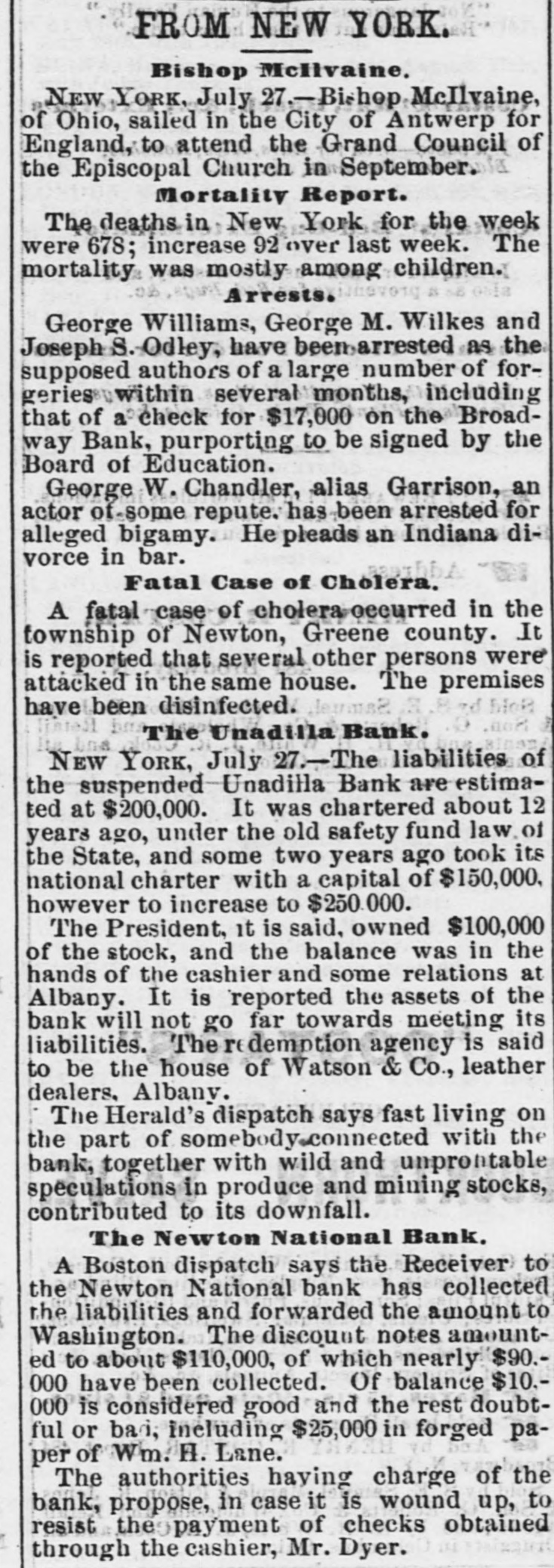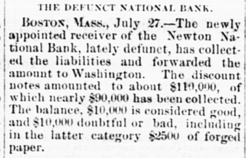 NATIONAL BANK TROUBLES. Reported Collapse of the Unadilla National Bank-Liabilities $200,000. A report reached the city yesterday that the National Bank at Unadilla, in Otsego county, liaNew York, had made a bad break, with bilities said to amount to $200,000. The bank was chartered about twelve years ago, under the old Safety Fund law of this State, and about two years since it took its national character, with a capital of $150,000, and power to increase to $250,000. Its officers were Arnold B. Watson, President and Clark J. Hayes, Cashier. The President, it is said, owned $100,000 of the capital, and the balance was in the hands of the Cashier and some relatives in Albany. will It is reported that the assets of the bank not go far towards meeting its liabilities. Fast living on the part of somebody connected with the institution, together with wild and unprofitable speculations in produce and mining stocks, contributed to its downfall. Its redemption agency is said to be the house of Watson & Co., leather dealers, of Albany. N. Y. Heraid. TROY, N. Y. July 27.-It appears upon trustworthy information that the management of the Unadilla National Bank has been of an exceedingly reckless character. The managers of the bank own a large majority of the stock, and it understood that they have lost it in extravagant mining and produce speculations. In doing this they have not only used up the capital of the bank, but have also taken the special deposits, at a very heavy rate of interest, from all the old farmers and other confiding people in the neighborhood. On these special deposits they have paid seven per cent. interest, while the usual interest upon such deposits ranges not to exceed five per cent., and oftentimes as low as four per cent also learn that many of the merchants in and around that neighborhood have been sending certific ates of deposit on this bank to pay their debts in New York, which, having been returned to the bank for New York funds, have remained in the hands of the Unadilla Bank unpaid. It 18 probable that the holders of these certificates will be compelled to await the action of the receiver, to be appointed, before the they can ascertain what proportion of assets they will receive as dividends. For some time the authorities of this bank have struggled to get back under the old State system, to the end that they might administer their affairs much more economically and with less popular suspicion. Of course the innocent people of that section of the country are in the highest state of alarm and indignation at the reckless acts of the bank officers. Corresponding banks throughout the country, which have sent the Unadilla items for collection, have in no instance received a response for some time past. Hence it has been found necessary to send special agents to Unadilla to ascertain the true status of affairs. It appears that the Government Examining Agent some time since paid the bank an official visit to ascertain its standing, and to learn it it was complying with the National Banking law. It is understood that the bank was then very deficient in the number of legal-tenders which the law required it to have on hand. This shows full well that the law can be violated at any time by all national bank officers. In the case of this failure, as in many other similar instances, it has been ascertained that the legaltender security to be kept in the bank for the benefit and safety of depositors has always been found missing when the receivers are appointed. The assets of the bank are very light compared with the liabilities. Defunct Newton (Mass.) National Bank. BOSTON, Mass., July 27. -The newly appointed receiver of the Newlon National Bank, lately defunct, has collected the liabilities and forwarded the amount to Washington. The discount notes amount to $ 110.000, of which a nearly $90,000 has been collected. The balance, f $10,000, is considered good, and $10,000 doubtfulor bad, including in the latter category $2500 a of forged paper of William H. Lane. The authorities having charge of the bank 0 propose, in case it is wound up, to resist the payment of the checks obtained through the cashier, Mr. Dyer. e d The Weedsport Bank Defalcation. The Auburn Advertiser prints the following e respecting the collapse of the Weedsport Bank:'We are informed that the failure is in conseo quence of dabbling in stocks by a prominent y officer of the bank. who, finding himself in a close corner, pledged everything available in le order to carry the speculations along while h awaiting a rise in stocks, and effecting an insuh rance to the amount of $30,000 on his life to be f used as 'collateral.' The failure sweeps the entire capital of the bank $100,000. We une derstand a receiver is to be appointed at once to is wind up its affairs." ts Additional Particulars of the Collapse of S the Unadilla National Bank. TROY, N. Y., July 28. The assignment of the Unadilla National Bank is a general one. and the institution is still kept open according y law. though doing no business. A receiver al from Washington has been applied for, and will a probably arrive in a few days. The owner of of $20,000 ot the stock in Albany is a son of Mr. Watson, the President of the bank. s tated or by the President and Cashier that had the bank al been closed some months ago, something would e. have been saved; as it is, the loss will, I am told, be total. ed I telegraphed last night, great distress prent vails in ali the country surrounding Unadilla. a he my information showing that one woman, nt widow, has become crazed by her losses, and that another has attempted to commit suicide. eir The losses cover a wide extent of country, and as will be desolating in their effects. Probable Collapse of the Whole National he Bank System. ny The following National Bank failures have ny been reported within the past few days. The weakness of the whole system is here exhibited. hip If in piosperous times these institutions c
