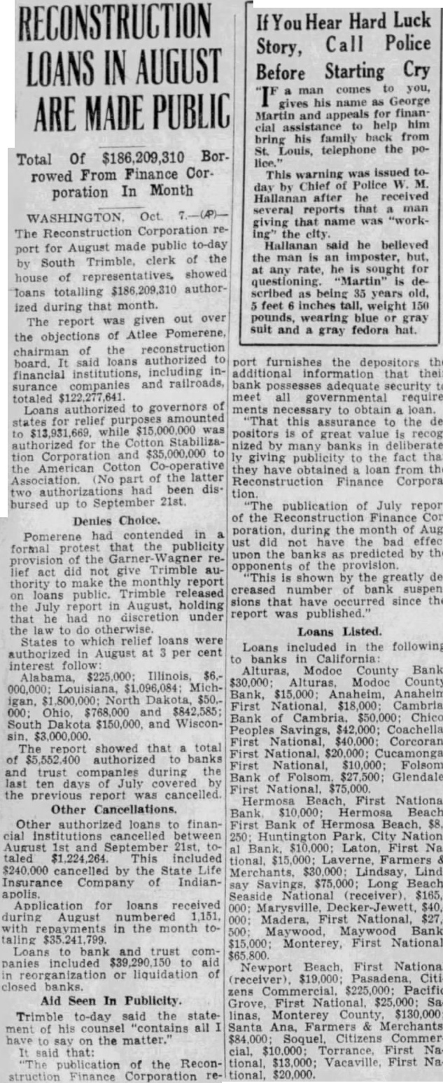 RECONSTRUCTION LOANS IN AUGUST ARE MADE PUBLIC Total Of $186,209,310 Borrowed From Finance Corporation In Month The Reconstruction Corporation report for August made public to-day by South Trimble, clerk of the house of representatives. showed loans totalling $186,209,310 authorized during that month. The report was given out over the objections of Atlee Pomerene, chairman of the reconstruction board. said loans authorized to financial institutions, including insurance companies and railroads, totaled Loans authorized to governors of states for relief purposes amounted to $13,931,669. while $15,000,000 was authorized for the Stabilization Corporation and $35,000,000 to the American Cotton Co-operative Association. No part of the latter two had been dis bursed up to September 21st. Denies Choice. Pomerene had contended in formal that the publicity provision of the Garner Wagner relief act did not give Trimble authority make the monthly report on loans public. Trimble released the July report in August, holding that he had no discretion under the law to otherwise States to which relief loans were authorized in August at 3 per cent interest Alabama, $225,000; Illinois, $6.000,000; Louisiana, $1,096,084: Mich000; Ohio, $768,000 and $842,585; South Dakota $150,000. and Wiscon$3,000,000. showed that a total of $5,552 authorized to banks and trust companies during the last ten days of July covered the previous report was cancelled. Other Cancellations. Other authorized loans to financial institutions cancelled between August and September 21st. totaled $1,224,264 This included $240,000 cancelled by the State Life Insurance Company of Indianapolis. Application for loans received during August numbered 1,151, with repayments in the month totaling to bank and trust companies included $39,290,150 to aid in reorganization or liquidation of closed banks. Aid Seen In Publicity Trimble to-day said the statement of his counsel "contains all have to say on the matter.' It said that: "The publication of the Reconstruction Finance Corporation re- If You Hear Hard Luck Call Police Story, Before Starting Cry man comes you, his name as George gives Martin and appeals for finan to help him cial assistance bring his family back from St. Louis, telephone the police. This warning was issued today by Chief Police W. M. Hallanan after he received several reports that man giving that name was "workthe city. Hallanan said he believed the man is an imposter, but, at any rate, he is sought for questioning. "Martin" is described as 35 years old, feet inches tall, weight 150 wearing blue gray suit and a gray fedora hat. port furnishes the depositors the additional information that their bank adequate security to meet all governmental requirements to obtain loan. "That this assurance to the depositors is of great value is recognized by many banks in deliberately giving publicity to the fact that they have obtained loan from the Reconstruction Finance Corporation. "The publication of July report of the Reconstruction Finance Corporation, during the month of August did not have the bad effect upon the banks as predicted by the opponents of the provision. "This is shown by the greatly decreased number bank suspensions that have since the report was published. Loans Listed. Loans included in the following to banks in California Alturas, Modoc County Bank, $30,000 Alturas. Modoc County Bank, $15,000 Anaheim, Anaheim Peoples Savings, $42,000; Coachella, First National. $20,000 Cucamonga, First National, $10,000: Folsom, Bank of Folsom. $27,500; Glendale, First National $75,000 Hermosa Beach, First National Bank $10,000; Hermosa Beach, First Bank of Hermosa Beach, $8,tional, Farmers & Merchants, $30,000 Lindsay Lindsay $75,000 Long Beach. National (receiver). $165,$15,000; Monterey, First National, Newport Beach First National zens $225,000 Pacific Grove, First National. $25,000: Salinas, Monterey County, $130,000; Santa Ana, Farmers & Merchants, $84,000; Soquel, Citizens Commertional, $13,000; Vacaville, First National, $20,000.