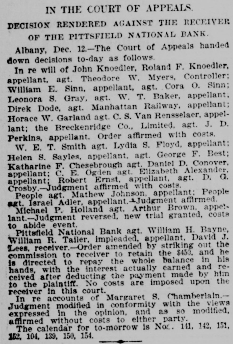 IN THE COURT OF APPEALS. DECISION RENDERED AGAINST THE RECEIVER OF THE PITTSFIELD NATIONAL BANK. Albany, Dec. 12.-The Court of Appeals handed down decisions to-day as follows. In re will of John Knoedler, Roland F. Knoedler, appellant, agt. Theodore W. Myers, Controller: William E. Sinn, appellant, agt. Cora O. Sinn; Leonora S. Gray, agt. W. T. Baker, appellant, Direk Dode, agt. Manhattan Railway, appellant; Horace W. Garland agt. C.S. Van Rensselaer, appellant; the Breckenridge Co., Limited, agt. J. D. Perkins, appellant. Order affirmed with costs. W. E. T. Smith agt. Lydia S. Floyd, appellant: Helen S. Sayles, appellant, agt. George F. Best; Katharine F. Chesebrough agt. Daniel D. Conover, appellant; C. E. Ogden agt. Elizabeth Alexander, appellant; Robert Ernst, appellant, agt. D. G. Crosby.-Judgment affirmed with costs. People agt. Mathew Johnson, appellant: People agt. Israel Adler, appellant.+Judgment affirmed. Michael P. Holland agt. Arthur Brown, appe:lant.-Judgment reversed, new trial granted, costs to abide event. Pittsfield National Bank agt. William H. Bayne, William R. Tailer, impleaded, appellant, David J. Lees, receiver.-Order amended by striking out the commission to receiver to retain the $450. and he is directed to repay the whole balance in his hands, with the interest actually earned and received after deducting the payment made by him to the plaintiff. No costs are imposed upon the receiver in this court. In re accounts of Margaret S. Chamberlain.Judgment modified in conformity with the views expressed in the opinion, and as so modified, affirmed without costs to either party. The calendar for to-morrow is Nos. 141, 142, 151, 152, 104, 139, 150, 154.