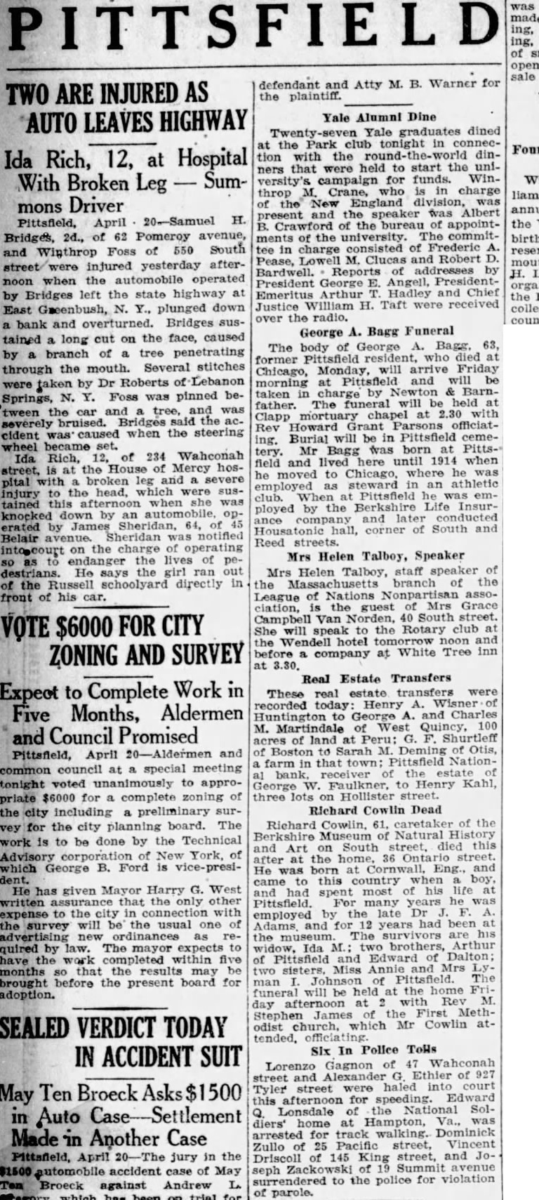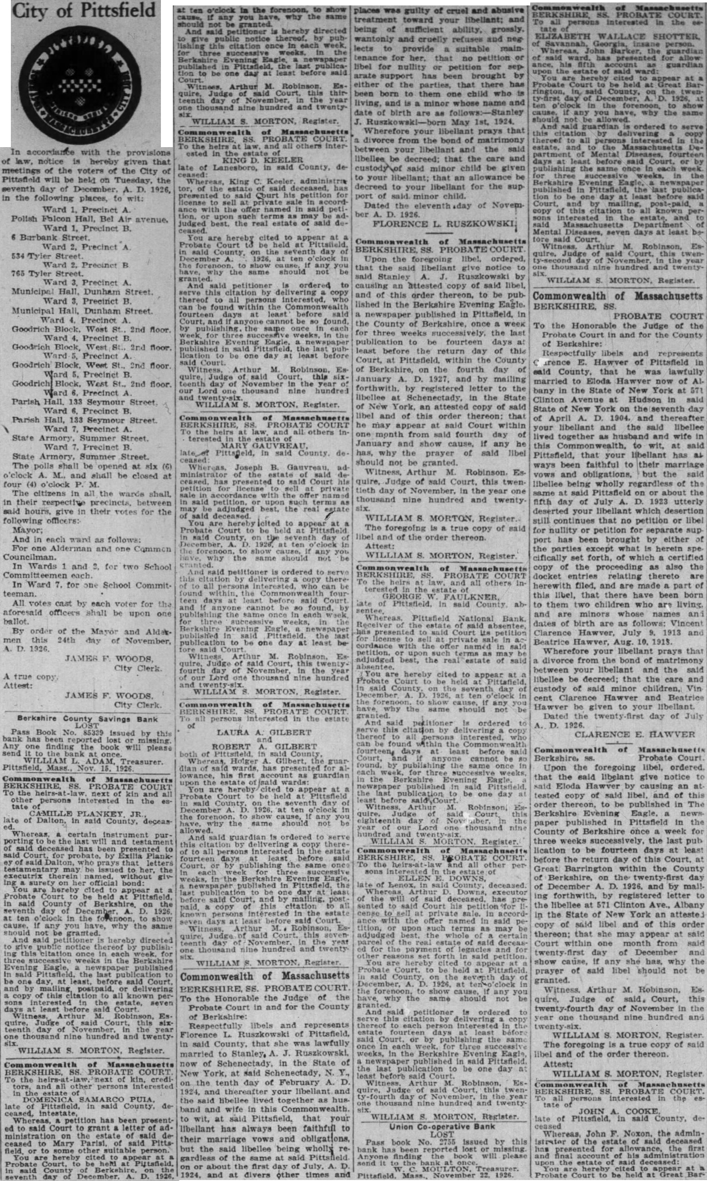 City of Pittsfield In accordance with the provisions of law, notice is hereby given that meetings the voters the City of Pittsfield will held on Tuesday, the day December, A. D. 1926, in the following places, wit: Ward Precinct Polish Folcon Hall, Bel Air avenue. Ward 1, Precinct B. 6 Barbank Street. Precinct Tyler Street Ward Precinct B 765 Tyler Precinct A. Municipal Hall Dunham Street. Ward Precirict B. Municipal Hall, Dunham Street. Precinct Goodrich West St. 2nd floor. Goodrich West 2nd floor. Precinct Goodrich Block, West St. 2nd floor Precinct B. Goodrich Block, West St., 2nd floor. Ward Precinct Parish Hall. 133 Seymour Street Ward Precinct B. Parish Hall, 133 Seymour Street. Ward Precinct State Armory, Summer Street. Ward Precinct State Armory, Summer Street. The polls shall opened at six (6) o'clock and shall closed at four (4) o'clock P. citizens in all the wards shall, in their precincts, between hours, give their votes for the following officers: Mayor; And in each ward as follows: For one and one Common In Wards and 3. for two School In Ward 7. for one School CommitAll cast by each voter for the officers shall be upon one ballot. By order Mayor and Aldakthis 24th November, 1926. JAMES WOODS, City Clerk A true copy, Attest: JAMES F. WOODS. City Clerk Berkshire County Savings Bank Pass No. has issued by Any one the will book please send WILLIAM Treasurer. Pittsfield, Mass. 1926 of To the other persons in the tate CAMILLE PLANKEY JR late of in deceas- certain instrument and has been presented Plankprays letters may be her, bond: are Probat be held in County on the at ten the cause, If any you why the same not be granted. hereby directed weeks Berkshire one and by mailing, delivering all perthe seven least before Robinson, Es. quire, said sixteenth the nine hundred and twentysix. WILLIAM S. MORTON. Register. of BERKSHIRE, COURT the of kin, creditors, and PUIA, late in County, deWhereas, petition has been presented to said to grant of ceased Mary other Parisi, said Pittshereby appear Probate seventh day at ten in the to show why the same And said petitioner hereby directed notice by last be one day at least Arthur M. quire, this day and WILLIAM S. MORTON, Register. ested in KING KEELER late of Lanesboro, said County, deKing tor, of has his license sale the offer named in said upon may judged best. the real estate of said ceased. are cited appear Probate Court day 1926, the why the same should not And said petitioner ordered to serve this delivering interested, copy be found fourteen least before found, by the the lication one at Witness, Arthur quire, teenth day November year our Lord nine and WILLIAM MORTON. Register. terested Pittsfield, In said County. de. ceased Joseph B. ministrator said ceased. presented to said license with the upon may adjudged best, the real said You hereby to Probate Court appear day the show cause, why the same should said ordered to serve delivering copy therewho can said cannot be found. Evening one day at least Arthur M. Esof said this the Lord thousand nine year and WILLIAM MORTON, Register. in the estate LAURA GILBERT ROBERT GILBERT of Holger Gilbert, guar has his first guardian Probate Court ten the any why same allowed is ordered to serve this least the for day leas and citation the estate said teenth day one thousand six. WILLIAM MORTON Register. Commonwealth of Massachusetts PERKSHIRE SS. PROBATE Honorable the Judge of the To the Probate Court in and for the County of Berkshire: Respectfully libels and represents Florence L. Ruszkowski of Pittsfield. said County, that she lawfully married Stanley, Ruszkowski. now Schenectady, in the State New York, at said Schenectady, N. on the tenth day of February A. 1924, and thereafter the together as hus. and wife this to wit, said that your libellant has always been faithful to their marriage vows and obligations, but libellee being wholly gardless of the first day July, 1924, and at divers other times places was guilty of cruel and abusive treatment toward your libellant: and being sufficient wantonly and cruelly refuses and neg lects provide suitable mainfor that petition or libel for nullity petition for arate support has brought by either of the parties, that there has born them child who is living, is minor whose name and of birth as J. May 1st, 1924. Wherefore your libellant prays divorce from the bond matrimony your and the said libellee decreed; that the care and child be to your that an be to your for the supof child. Dated day of NovemFLORENCE L. RUSZKOWSKI, Massachusetts Upon the foregoing libel. ordered. that libellant notice said by an attested copy of said libel, and of this order thereon, to be published in the Berkshire Evening Eagle. published in Pittsfield. in the County of Berkshire once week three weeks the last publication be fourteen days before return day this Court, Pittsfield. within County of Berkshire, on fourth day January 1927, and by mailing forthwith registered letter to the libellee Schenectady, in the State of New an attested copy of said libel order thereon: that he may appear at said Court within from fourth day of and show If any he has, the prayer said libel not be granted. M. Robinson. Esquire, of said Court, this twen. tieth day In the one nine hundred and twenty. six WILLIAM S. MORTON Register. The true of said libel and of the order thereon. Attest: WILLIAM S. MORTON, Register. COURT To others all terested late of Pittsfield. In abPittsfield National Bank Receiver absentee, Court its license cordance with the named adjudged the said You hereby cited to appear the any why same be And ordered this delivering copy can be at before said anyone cannot be same for the Evening in the be day at said our nine Register. To the other per sons said Downs, has cense the In said upon may the the and You said the why the same should not by said the same for Berkshire Eagle the be one day at Es. and twenty six. WILLIAM MORTON, Register. Union Bank Pass book No. by this has book