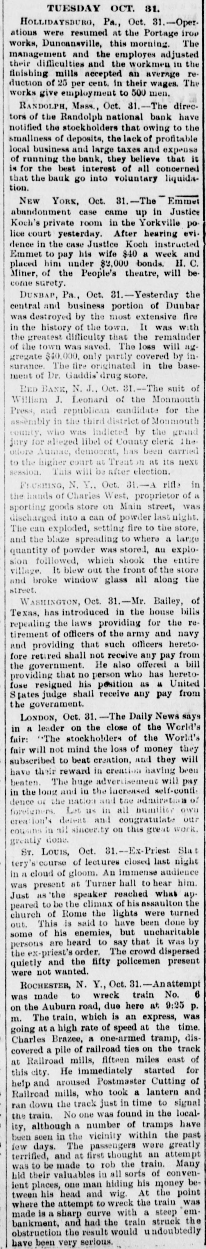 TUESDAY OCT. 31. HOLLIDAYSBURG, Pa., Oct. 31.-Operations were resumed at the Portage irop works, Duncansville, this morning. The management and the employes adjusted their difficulties and the workmen in the finishing mills accepted an average reduction of 25 per cent. in their wages. The works give employment to 500 men. RANDOLPH, Mass., Oct. 31.-The directors of the Randolph national bank have notified the stockholders that owing to the smallness of deposits, the lack of profitable local business and large taxes and expense of running the bank, they believe that it is for the best interest of all concerned that the bauk go into voluntary liquidation. NEW YORK, Oct. 31.-The Emmet abandonment case came up in Justice Koch's private room in the Yorkville police court yesterday. After hearing evidence in the case Justice Koch instructed Emmet to pay his wife $40 a week and placed him under $2,000 bonds. H. C. Miner, of the People's theatre, will become surety. DUNBAP, Pa., Oct. 31.-Yesterday the central and business portion of Dunbar was destroyed by the most extensive fire in the history of the town. It was with the greatest difficulty that the remainder of the town was saved. The loss will aggregate $40.000, only partly covered by insurance. The fire originated in the basement of Dr. Gaddis' drug store. RED BANK, N. J., Oct. 31.-The suit of William J. Leonard of the Monmouth Press, and republican candidate for the assembly in the third district of Monmouth county. who was indicted by the grand jury for alleged libel of County clerk The odore Aumac, democrat, has been carried to the higher court at Trent in at its next session. This will be after election. FLUSHING, N. Y., Oct. 31.-A rifle in the hands of Charles West, proprietor of a sporting goods store on Main street, was discharged into a can of powder last night. The can exploded, setting fire to the store, and the blaze spreading to where a large quantity of powder was stored, an explosion followed, which shook the entire village. It blew out the front of the store and broke window glass all along the street. WASHINGTON, Oct. 31.-Mr. Bailey, of Texas, has introduced in the house bills repealing the laws providing for the retirement of officers of the army and navy and providing that such officers heretofore retired shall not receive any pay from the government. He also offered a bill providing that no person who has heretofose resigned his position as a United States judge shall receive any pay from the government. LONDON, Oct. 31.-The Daily News says in a leader on the close of the World's fair: The stockholders of the World's fair will not mind the loss of money they subscribed to beat creation, and they will have their reward in creation having been beaten. The huge advertisement will pay in the long and in the increased self-confi. dence or the nation and the admiration of foreigners. Let us 111 all humility own creation's defent and congratulate our cousins in all sincerity on this great work. greatly done. ST. Louis, Oct. 31.--Ex-Priest Slat tery's course of lectures closed last night in 11 cloud of gloom. An immense audience was present at Turner hall to hear him. Just as 'the speaker reached what aypeared to be the climax of his assaulton the church of Rome the lights were turned out. This is said to have been done by some of his enemies, but uncharitable persons are heard to say that it was by the ex-priest's order. The crowd dispersed quietly and the fifty policemen present were not wanted. ROCHESTER, N. Y., Oct. 31.-Anattempt was made to wreck train No. 6 on the Auburn road, due here at 9:25 p. m. The train, which is an express, was going at a high rate of speed at the time. Charles Brazee, a one-armed tramp, discovered a pile of railroad ties on the track at Railroad mills, fifteen miles east of this city. He immediately started for help and aroused Postmaster Cutting of Railroad mills, who took a lantern and ran down the track just in time to signal the train. No one was found in the locality, although a number of tramps have been seen in the vicinity within the past