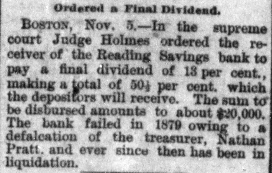 Ordered a Final Dividend. BOSTON, Nov. 5.-In the supreme court Judge Holmes ordered the receiver of the Reading Savings bank to pay a final dividend of 13 per cent., making a total of 50g per cent. which the depositors will receive. The sum to be disbursed amounts to about $20,000. The bank failed in 1879 owing to a defalcation of the treasurer, Nathan Pratt. and ever since then has been in liquidation.