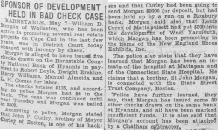SPONSOR OF DEVELOPMENT HELD IN BAD CHECK CASE May D. Morgan of who real has estate been Cape Cod in the last few District Court today larceny by alleged to have issued five the County Bank of in ment Harry Robert Doyle, Hyannis Dwight Erskine, pay. Manuel Almeida and Gomes for labor The totaled $115, and accordMorgan had $4 the case Tuesday and Morgan was bailed to that police, Morgan stated John Curley, brother of Mayor Curley of Boston, is one of and that Curley had been going to ers send $5000 for deposit, but Morgan been held up by run on Roxbury Morgan said also that Louis bank. Corey of had put $500 the development of West Yarmouth, which Margan has been promoting in the name of the New England Shoes Exhibits, Inc. The police also state that they have learned that Morgan has been an inmate of the hospital at Mattapan and of the State Hospital. He claims that brother, St John Morgan, connected with the State Street Trust Company, Boston. "Police have further learned, they that Morgan has issued some 30 checks on the same bank at and have been funds. is also said that account has been attached by Chatham contractor,