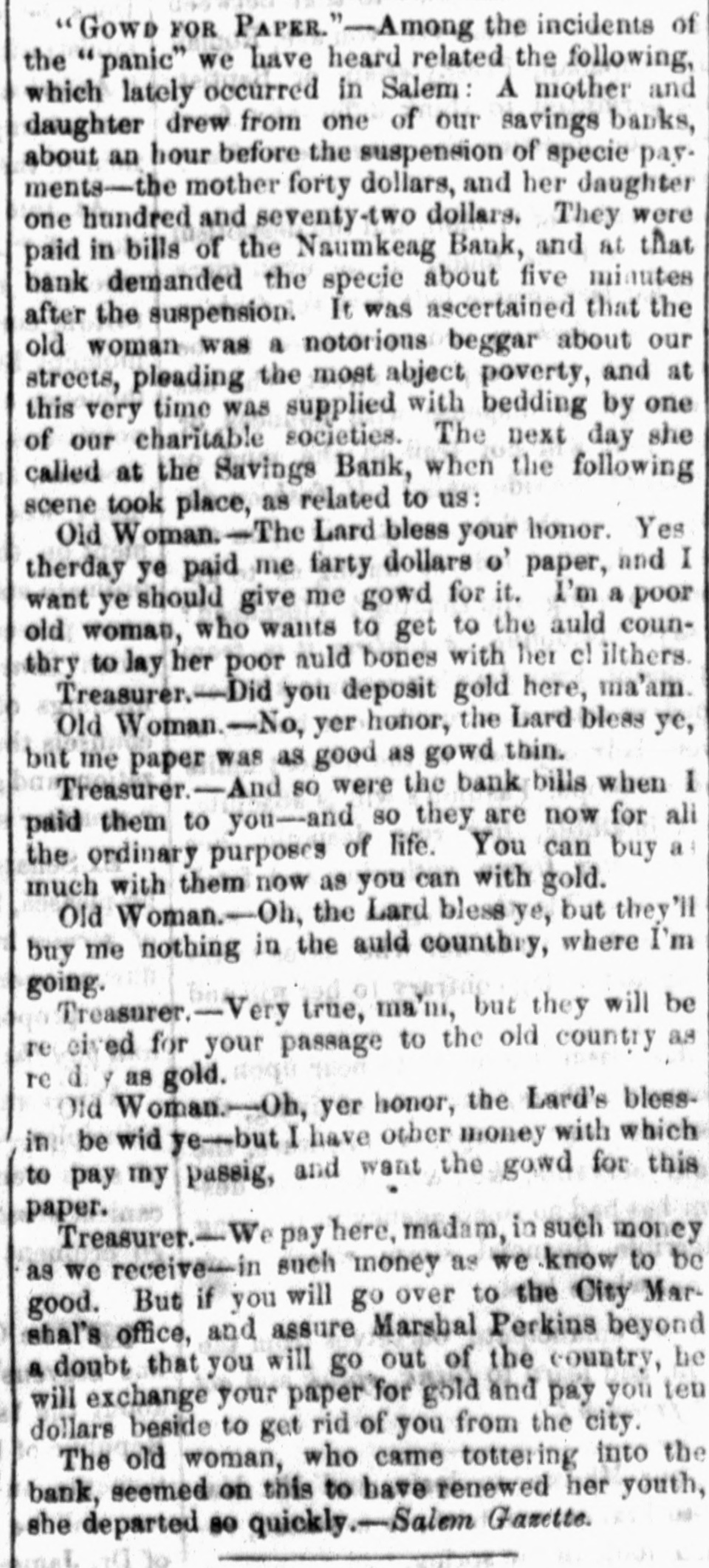 "Gowd FOR PAPER."-Among the incidents of the "panic" we have heard related the following, which lately occurred in Salem: A mother and daughter drew from one of our savings banks, about an hour before the suspension of specie payments-the mother forty dollars, and her daughter one hundred and seventy-two dollars. They were paid in bills of the Naumkeag Bank, and at that bank demanded the specie about five minutes after the suspension. It was ascertained that the old woman was a notorious beggar about our streets, pleading the most abject poverty, and at this very time was supplied with bedding by one of our charitable societies. The next day she called at the Savings Bank, when the following scene took place, as related to us: Old Woman.-The Lard bless your honor. Yes therday ye paid me farty dollars o' paper, and I want ye should give me gowd for it. I'm a poor old woman, who wants to get to the auld counthry to Jay her poor auld bones with her chilthers. Treasurer.-Did you deposit gold here, ma'am. Old Woman.-No, yer honor, the Lard bless ye, but me paper was as good as gowd thin. Treasurer.-And so were the bank bills when I paid them to you-and so they are now for ali the ordinary purposes of life. You can buy a much with them now as you can with gold. Old Woman.-Oh, the Lard bless ye, but they 'Il buy me nothing in the auld counthry, where I'm going. Treasurer. - Very true, ma'm, but they will be re eived for your passage to the old country as re d. as gold. Old Woman.-Oh, yer honor, the Lard's blessin be wid ye-but I have other money with which to pay my passig, and want the gowd for this paper. Treasuret.-We pay here, madam, in such money as we receive--in such "money as we know to be good. But if you will go over to the City Marshal's office, and assure Marshal Perkins beyond a doubt that you will go out of the country, be will exchange your paper for gold and pay you ten dollars beside to get rid of you from the city. The old woman, who came tottering into the bank, seemed on this to have renewed her youth, she departed so quickly.-Salem Gazette.