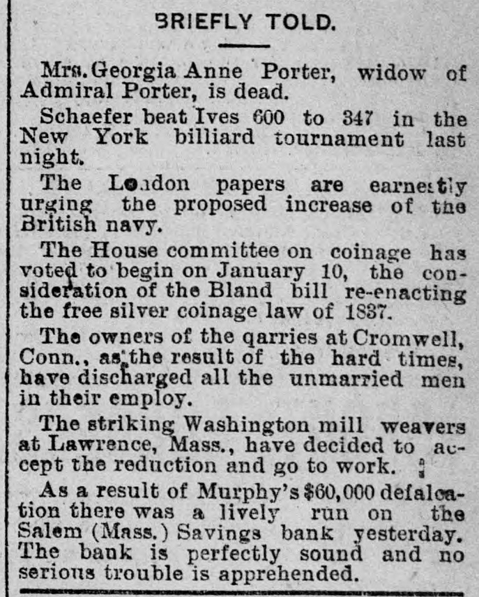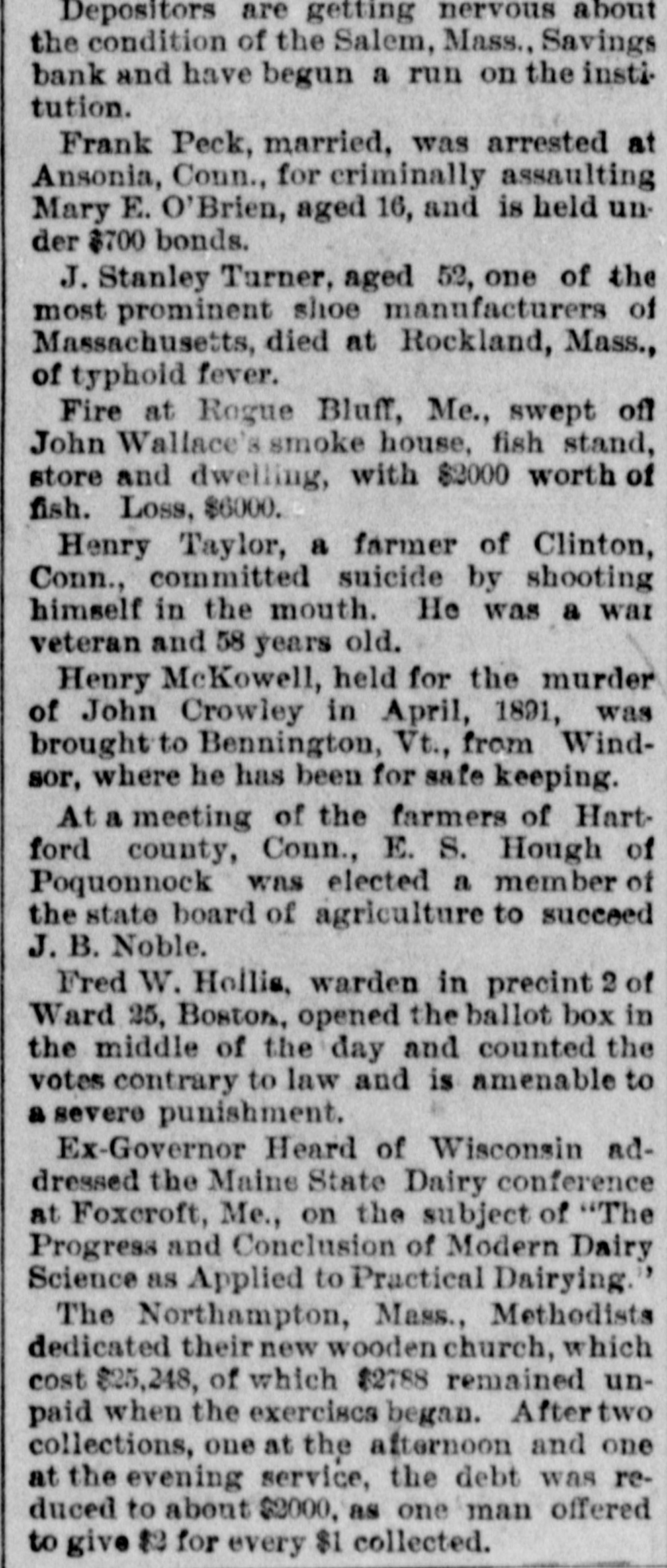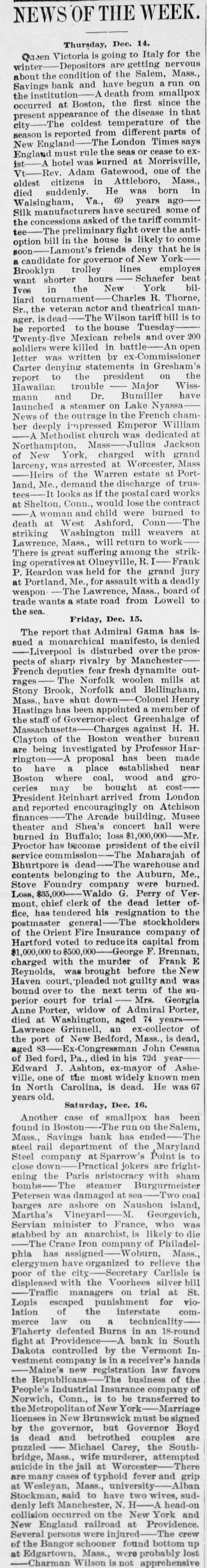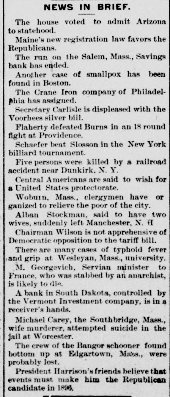 A case of smallpox has been discovered in Somerville, Mass. Fifteen hundred Lehigh Valley strikers are out of work