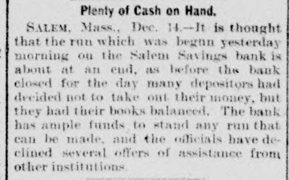Depositors are getting nervous about the condition of the Salem, Mass., Savings bank and have begun a run on the institution
