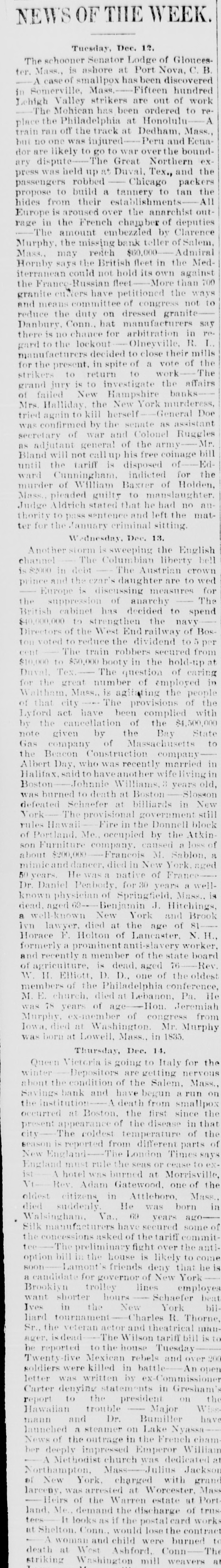 Hon. Jeremiah Murphy, ex-member of congress from Iowa, died at Washington. Mr. Murphy was born at Lowell, Mass., in 1835.