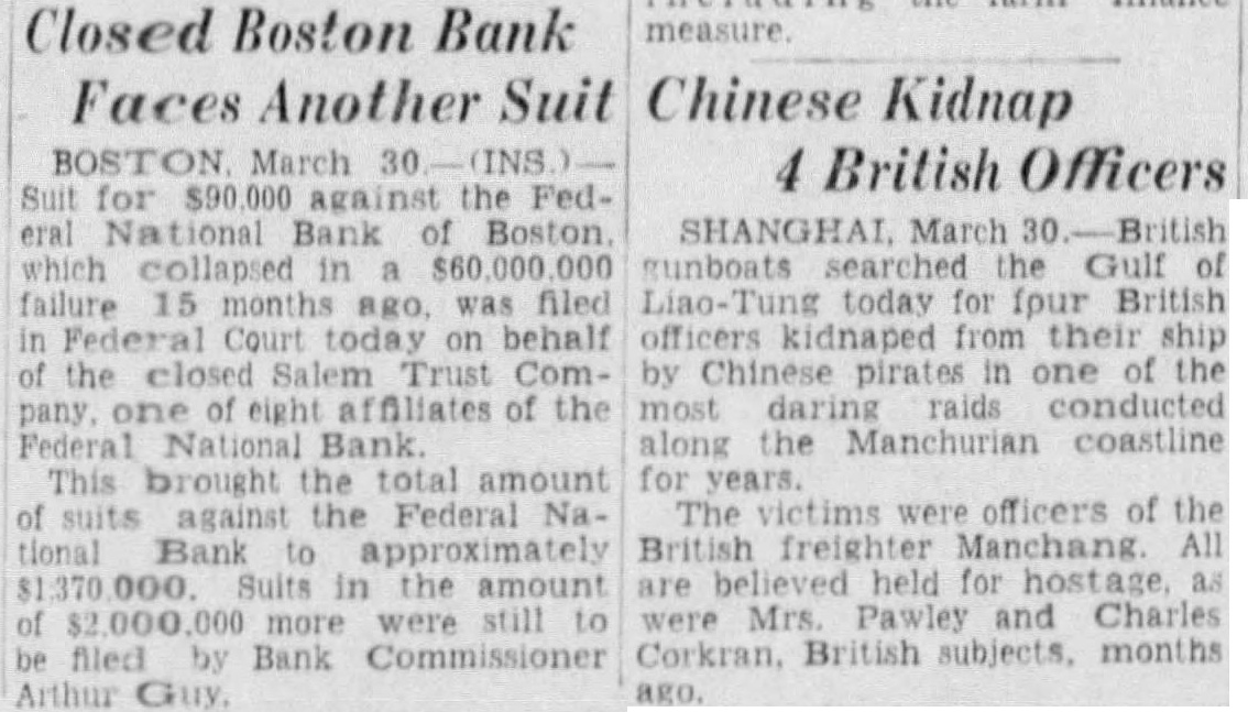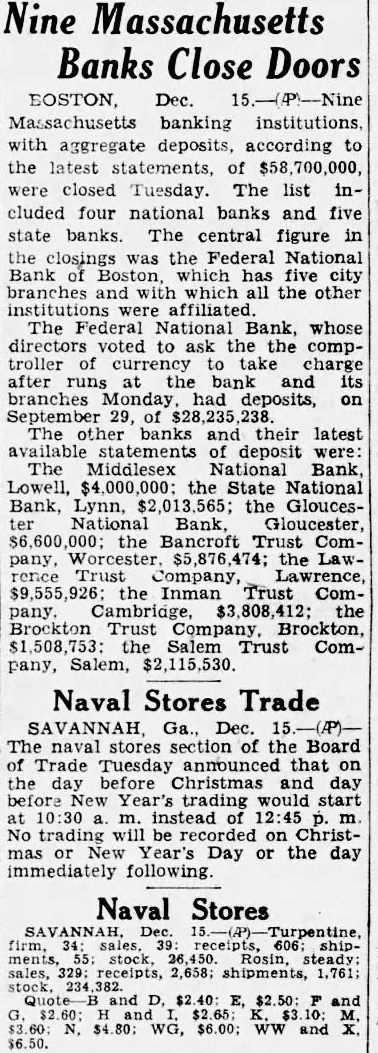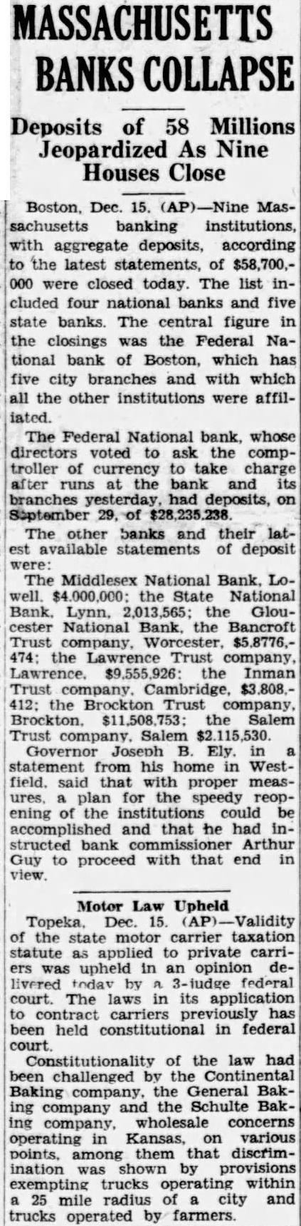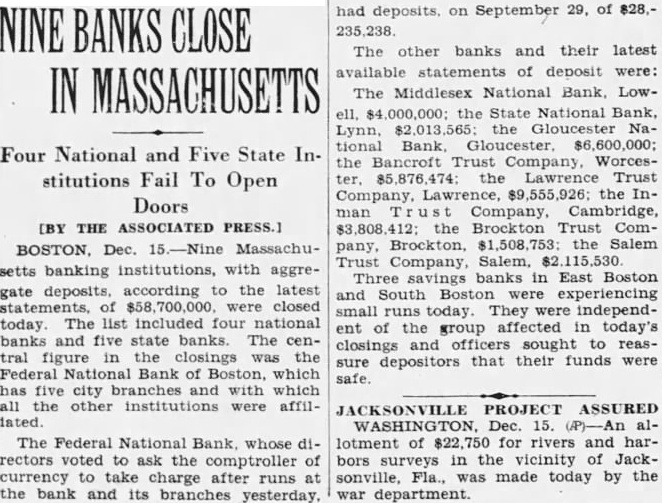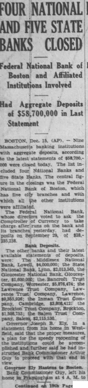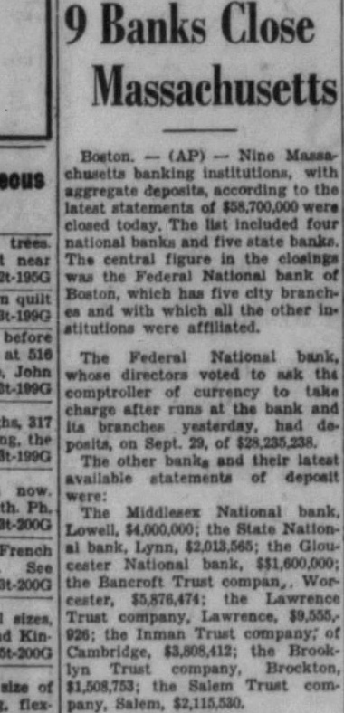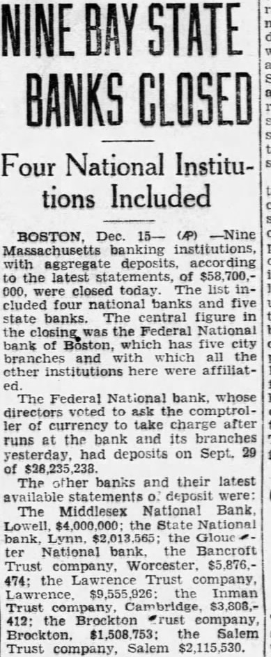 9 BAY STATE BANKS FAIL WITH $58,700,000 DEPOSITS sachusetts banking institutions, with aggregate deposits of $58,700,00, were closed today in the midst of the Christmas shopping season. The list included four National banks and five State banks. The central figure in the closings was the Federal National Bank of Boston, which has five city branches and with which all the other institutions were affiliated. The Federal National Bank, whose directors asked the Controller of Currency to take charge after runs at the bank and its branches yesterday, had deposits Sept. 29 of $28,235,238.