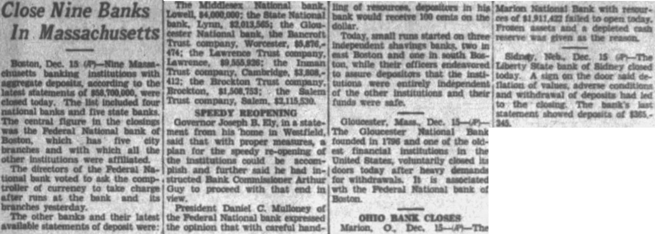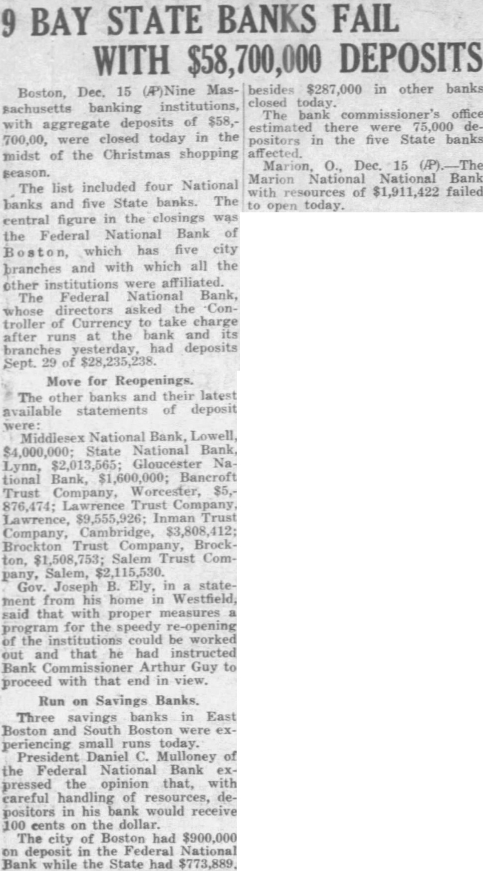 Three savings banks in East Boston and South Boston were experiencing small runs today. President Daniel C. Mulloney of the Federal National Bank expressed the opinion that, with careful handling of resources, depositors in his bank would receive 100 cents on the dollar. The city of Boston had $900,000 on deposit in the Federal National Bank while the State had $773,889. closed today. The bank commissioner's office estimated there were 75,000 depositors in the five State banks affected. Marion, O., Dec. 15 (/P).-The Marion National National Bank with resources of $1,911,422 failed to open today.