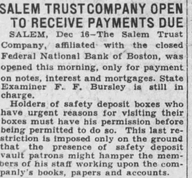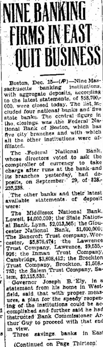 Move for Reopenings. The other banks and their latest available statements of deposit were: Middlesex National Bank, Lowell, $4,000,000; State National Bank, Lynn, $2,013,565; Gloucester National Bank, $1,600,000; Bancroft Trust Company, Worcester, $5,876,474; Lawrence Trust Company, Lawrence, $9,555,926; Inman Trust Company, Cambridge, $3,808,412; Brockton Trust Company, Brockton, $1,508,753; Salem Trust Company, Salem, $2,115,530. Gov. Joseph B. Ely, in a statement from his home in Westfield, said that with proper measures a program for the speedy re-opening of the institutions could be worked out and that he had instructed Bank Commissioner Arthur Guy to proceed with that end in view.