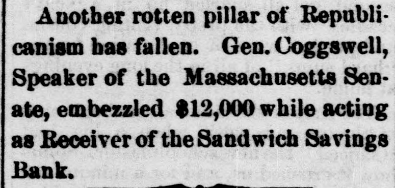 Gen. Coggswell, Speaker of the Massachusetts Senate, embezzled $12,000 while acting as Receiver of the Sandwich Savings Bank.