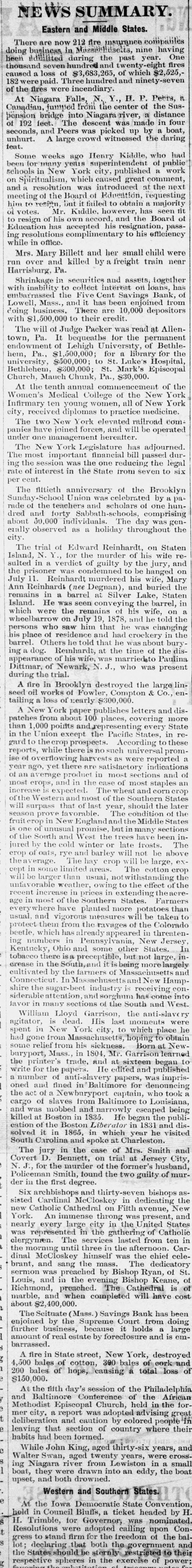 NEWS SUMMARY Eastern and Middle States. in Masseel There are now 212 fire insurance Insetts, nine having One been and doing diffilited business during the past year -eight fires thousand seven hundred $3,683,265, of which $2,525, caused were paid loss of Three hundred and ninet v-seven P it If of 182 the fires were incendiary y Petts, At Niagara jumped Falls, from N the center of the Sus- distance bension Canadian bridge into Niagara riv was made in four of 192 feet. The descent by boat unhurt. seconds, and A large Peers crowd was picked witnessed up the daring had teat. ago Henry Kiddle who of public Some weeks vellis superintendent work been many city published schools New York caused great comment on Spiritualism, which introduced at the next and resolution was Education, requesting meeting of the Board of to obtain majority him to resitty but failed however has seen tit of votes. Mr. Kiddle, accord, and the Board resign of his accepted his resignat ion, passing Education has complimentary to his efficiency while in office run Billett and her small child were near over Mrs Mary and killed by freight train Harrisburg, Pa. Shrinkage in securities and assets on loans, together has the crossed embarra with inability to collect Five Cent Interest Sa ings Bank of been from enjoined Lowell business Mass. and There has are 10.000 depositors doing with $1 500.000 to their credit of Judge Packer was read permanent at Allen town, The will Pa. It bequeaths Lehigh University for the of Bethle endowment of librar for the hem, Pa. $1,500,000 to for St Luke's Hospital $500,000; $300,000; St. Mark's Episcopa Bethlehem Chunk Pa., $30,000 Church, Mauch commenceme of the the tenth annual the New York At Medical College of of New York diplomas Infirmary Women's ten young women practice all medicine panies city, received New York vnted railroad operated com one The have two joined forces, and will be hereatt management adjourned under The New York Legislature financial has bill passed dur The most session important was the one reducing the legal six cent rate ing the of interest in the State from seven to the Brooklyn The fittieth anniversary celebrated of by a pa Sunday Union was scholars of one hunof the teachers and comprising rude dred and forty Sabbath chools The day was gen as erally observed about 50,000 indi viduals a holiday throughout the Staten city The trial of Edward murder Reinhardt of his on wife sulted Island in verdict for the of guilty by to be the hanged jury, and on Degna July the prisoner 11. Reinhardt was murder and his buried wife, Mary the remains conv veying Ann Reinhardt in barrel (nee at Silver Lake, the barrel, Staten Island He was the seen remain his wife, told the which were July 19 1878 was he changing and persons wheelbarrow who saw him that had he the at barrel. his place Others of residence told that the time about of the dis- bury appearance N J. who ing dog. of Reinhard his wife was present Paulina Dittmar, of Newark during the trial. the lin large A fire works in Brooklyn of Fowler destroyed Compton & Co. tailing seed oil loss of nearly $300 .000 and dis letters publishes New York paper 100 places, covering more patches from about every State than in the 1.000 Union points except and the Pacific According States to in these gard to the crop prospects is no while such there reports, reported indications most of most staple and corn wheat the The Middle in but The large, cotton the effect the the the the Southern States. atoes more planted than 11 be to measures taken them in beetle which usual, vigorou from the ravages of the threaten Colorado New Pennsy Ivania, numbers other In States. Kentucky Ohio and some entible but not large, intobacc there is a South,and it is being more largely In crease the by the farmers of Massa New Hamp shire industi has into sorghum come javor siderable tions and of the South and the Lloyd William anti-slav His dead last agitat he York city, which place to obtain relief from his spent had gone from New Massaci sickness ts. hoping Born at NewGarrison learned some Mass. in 1804, Mi sixteen began buryport, printer trade, and at edited and publishe antiwrite the for the papers He papers, was imprisdenouncing oned number and fined in Baltimore tain, for who took the of of slaves from Baltimore escaped to Louisiana, being cargo was mobbed and He began the publiand at Boston in 1835. in 1831 and disin it 1865, solved at and cation killed of the Boston Liberator which year he visited spoke Charleston South Carolina in the case of Mrs. Jersey Smith City, and The jury D. Bennett, on trial former's at husband, Smith Policeman Covert N.J. for the murder found of the the two guilty of murder in the first degree thirty bishops new Six archbishops McCloskey and dedicating New the sisted Catholic Cardinal Cathedral on Filth was avenue, present and York An immense large city throng in the United of Catholic States nearly every in the gathering in was represented services lasted from ten Car dinal clergymen. The three the ernoon. chief celemass. the morning McCloskey until himself was The the dedicatory was Bishop brant, and sang preached the by Bishop Ryan, Keane, of St. sermon Louis, and in the evening The Cathedral is of marble, Richmond, breached. when completed will have cost about $2,400,000 has Bank been Scituate (Mass. Savings Court from doing of amount enjoined The by the Supreme because it holds is large emfurther business real estate by foreclosure and York, destroyed 200 of barrassed A fire in State street, 300 New bales of cork and of bales hops, 500 bales of cotton, causing a total loss and $150,000 the fifth day's session of of the the Philadelphia African At Baltimore Conterence Church, held in the for Methodist city Episcopal report was adopted colored advising people great in mer deliberation that and section caution of country by where their habits leaving had been formed thirty six years, and While John King, twenty aged years, were cross 