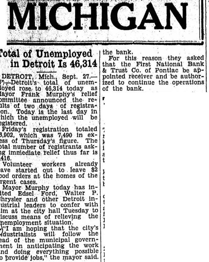 MICHIGAN Total of Unemployed in Detroit Is 46,314 Sept. total of unemployed rose to 46,314 today Mayor Frank Murphy's relief committee announced the results of two days of registration. Today is the last day in which the unemployed will be registered. Friday's registration totaled 26,902, which was excess of Thursday's figure. The total number of registrants asking immediate relief thus far is Volunteer workers already have started out leave $2 food orders at the homes of the urgent cases. Mayor Murphy today has inEdsel Ford, Walter Chrysler and other Detroit industrial leaders to confer with him at the city hall Tuesday discuss means relieving the Unemployment situation hoping that the city's dustrialists will follow the lead of the municipal government in anticipating the work and doing everything possible to provide jobs," the mayor said. the bank. For this reason they asked that the First National Bank Trust Co. of Pontiac be appointed receiver and be authorized to continue the operations of the bank.