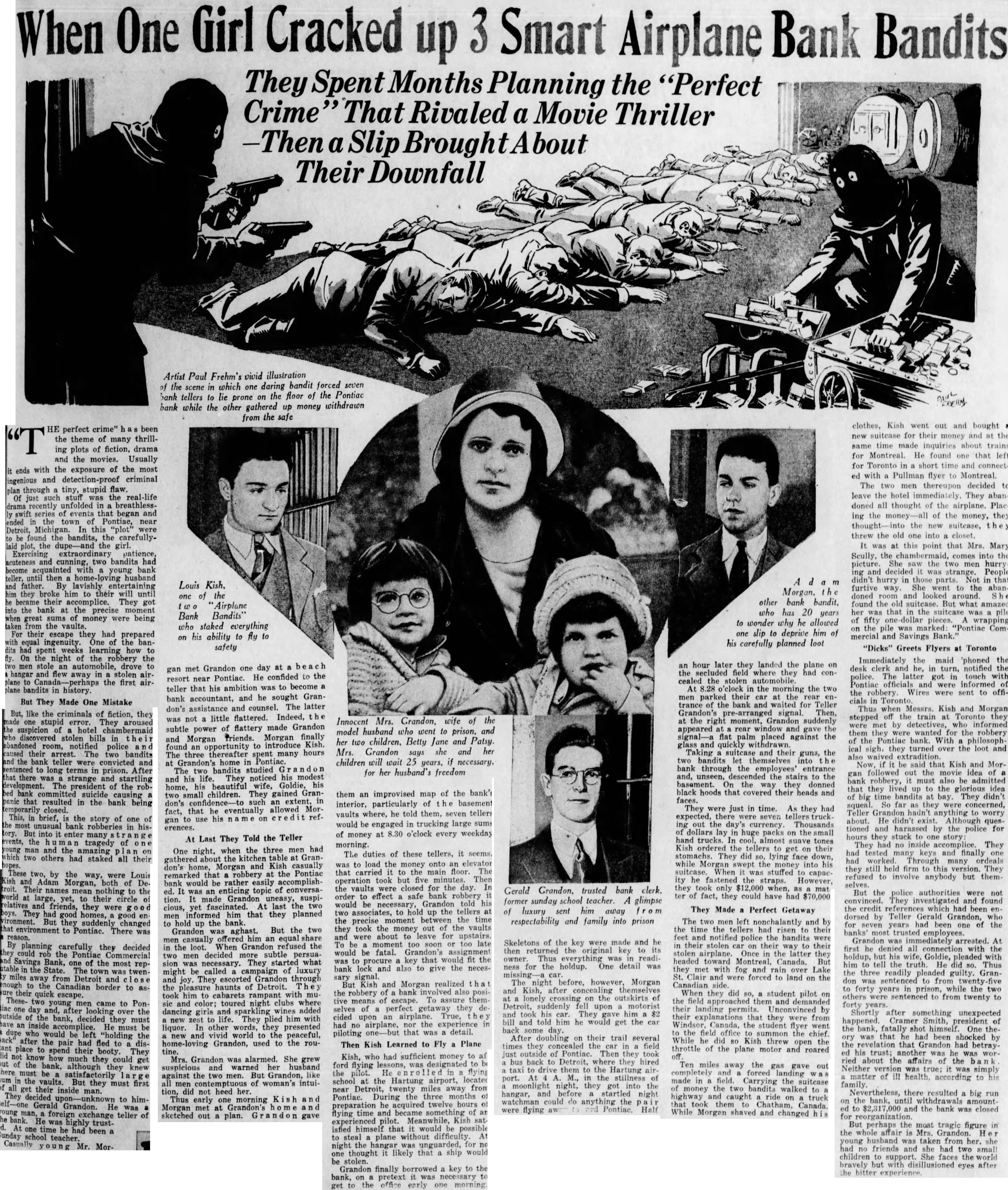 Immediately the maid 'phoned the desk clerk and he, in turn, notified the police. The latter got in touch with Pontiac officials and were informed of the robbery. Wires were sent to officials in Thus when Messrs. Kish and Morgan stepped off the train at Toronto they were met by detectives, who informed them they were wanted for the robbery of the Pontiac bank. With a philosophical sigh, they turned over the loot and also waived extradition. Now, if it be said that Kish and Morgan followed out the movie idea of a bank robbery, it must also be admitted that they lived up to the glorious idea of big time bandits at bay. They didn't squeal. So far as they were concerned, Teller Grandon hadn't anything to worry about. He didn't exist. Although ques. tioned and harassed by the police for hours they stuck to one story: They had no inside accomplice. They had tested many keys and finally one had worked. Through many ordeals they still held firm to this version. They refused to involve anybody but themselves. But the police authorities were not convinced. They investigated and found the credit references which had been endorsed by Teller Gerald Grandon, who for seven years had been one of the banks' most trusted employees. Grandon was immediately arrested. At first he denied all connection with the holdup, but his wife, Goldie, pleaded with him to tell the truth. He did so. Thus the three readily pleaded guilty. Grandon was sentenced to from twenty five to forty years in prison, while the two others were sentenced to from twenty to forty years. Shortly after something unexpected happened. Cramer Smith, president of the bank, fatally shot himself. One theory was that he had been shocked by the revelation that Grandon had betrayed his trust; another was he was worried about the affairs of the Neither version was true; it was simply matter of ill health, according to his family. Nevertheless, there resulted a big run on the bank, until withdrawals amount ed to $2,317,000 and the bank was closed for reorganization. But perhaps the most tragic figure in the whole affair is Mrs. Grandon. H young husband was taken from her. she had no friends and she had two small children to support. She faces the world bravely but with disillusioned eyes after the bitter experience.