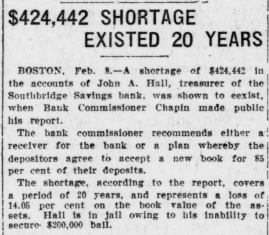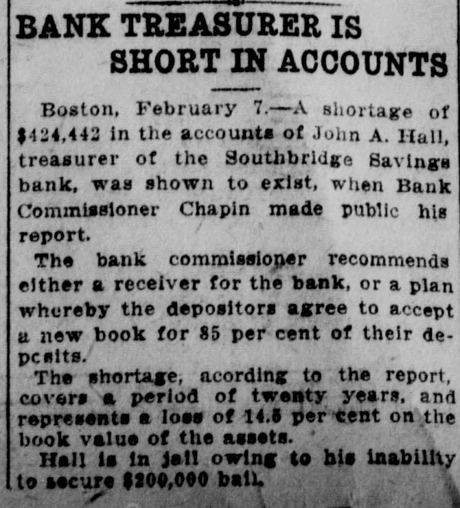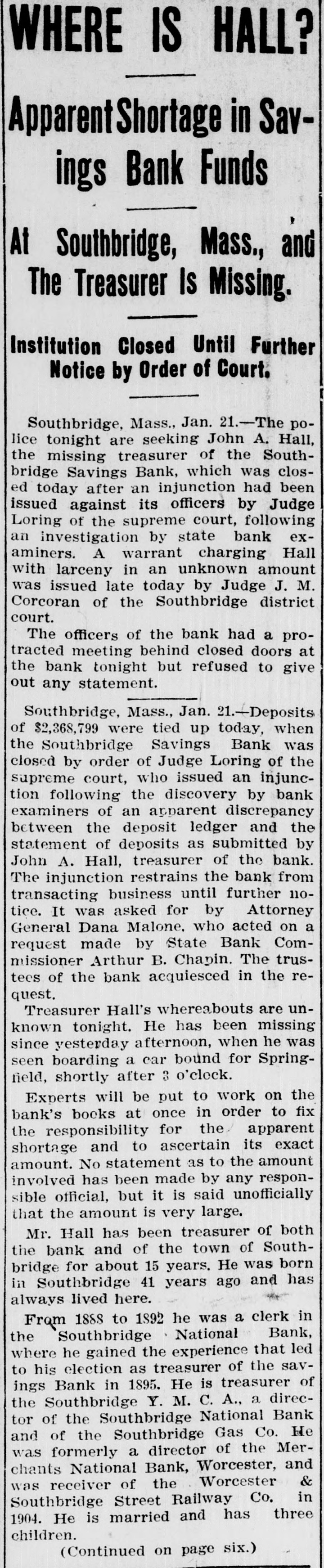 WHERE IS HALL? Apparent Shortage in Savings Bank Funds At Southbridge, Mass., and The Treasurer Is Missing. Institution Closed Until Further Notice by Order of Court. Southbridge, Mass., Jan. 21.-The police tonight are seeking John A. Hall, the missing treasurer of the Southbridge Savings Bank, which was closed today after an injunction had been issued against its officers by Judge Loring of the supreme court, following an investigation by state bank examiners. A warrant charging Hall with larceny in an unknown amount was issued late today by Judge J. M. Corcoran of the Southbridge district court. The officers of the bank had a protracted meeting behind closed doors at the bank tonight but refused to give out any statement. Southbridge, Mass., Jan. 21.-Deposits of $2,368,799 were tied up today, when the Southbridge Savings Bank was closed by order of Judge Loring of the supreme court, who issued an injunction following the discovery by bank examiners of an apparent discrepancy between the deposit ledger and the statement of deposits as submitted by John A. Hall, treasurer of the bank. The injunction restrains the bank from transacting business until further notice. It was asked for by Attorney General Dana Malone. who acted on a request made by State Bank Commissioner Arthur B. Chapin. The trustees of the bank acquiesced in the request. Treasurer Hall's whereabouts are unknown tonight. He has been missing since yesterday afternoon, when he was seen boarding a car bound for Springfield, shortly after 3 o'clock. Experts will be put to work on the bank's books at once in order to fix the responsibility for the apparent shortage and to ascertain its exact amount. No statement as to the amount involved has been made by any responsible official, but it is said unofficially that the amount is very large. Mr. Hall has been treasurer of both the bank and of the town of Southbridge for about 15 years. He was born in Southbridge 41 years ago and has always lived here. From 1888 to 1892 he was a clerk in the Southbridge National Bank, where he gained the experience that led to his election as treasurer of the savings Bank in 1895. He is treasurer of the Southbridge Y. M. C. A., a director of the Southbridge National Bank and of the Southbridge Gas Co. He was formerly a director of the Merchants National Bank, Worcester, and was receiver of the Worcester & Southbridge Street Railway Co. in 1904. He is married and has three children. (Continued on page six.)