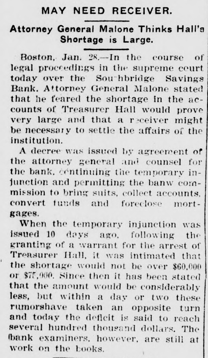 MAY NEED RECEIVER. Attorney General Malone Thinks Hall's Shortage is Large. Boston, Jan. 28.-In the course of legal proceedings in the supreme court today over the Sou-hbridge Savings Bank. Attorney General Malone stated that he feared the shortage in the accounts of Treasurer Hall would prove very large and that a receiver might be necessary to settle the affairs of the institution. A decree was issued by agreement of the attorney general and counsel for the bank. centinuing the temporary injunction and permitting the banw commission to bring suits, collect accounts. convert funds and foreclose mortgages. When the temporary injunction was issued 10 days ago, following the granting of a warrant for the arrest of Treasurer Hall, it was intimated that the shortage would not be over $60,000 or $75,000. Since then it has been stated that the amount would be considerably less, but within a day or two these rumorshave taken an opposite turn and today the deficit is said to reach several hundred thousand dollars. The (bank examiners. however, are still at work on the books.