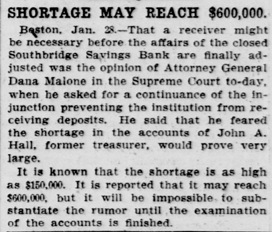 SHORTAGE MAY REACH $600,000. Beston, Jan. 28.-That a receiver might be necessary before the affairs of the closed Southbridge Savings Bank are finally adjusted was the opinion of Attorney General Dana Malone in the Supreme Court to-day, when he asked for a continuance of the injunction preventing the institution from receiving deposits. He said that he feared the shortage in the accounts of John A. Hall, former treasurer, would prove very large. It is known that the shortage is as high as $150,000. It is reported that it may reach $600,000, but it will be impossible to substantiate the rumor until the examination of the accounts is finished.