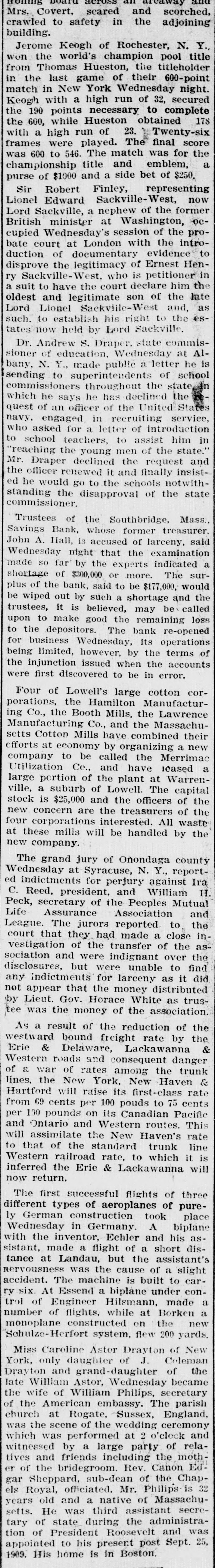 Covert, scared and scorched, to safety in the adjoining ilding. erome Keogh of Rochester, N. Y., the world's champion pool title Thomas Hueston, the titleholder the last game of their 600-point in New York Wednesday night. with a high run of 32, secured 190 points necessary to complete 600, while Hueston obtained 178 a high run of 23. Twenty-six were played. The final score 600 to 546. The match was for the ampionship title and emblem, a of $1000 and a side bet of $250. Robert Finley, representing Edward Sackville-West, now Sackville, a nephew of the former minister at Washington, OCWednesday's session of the procourt at London with the introof documentary evidence to prove the legitimacy of Ernest HenSackville-West, who is petitioner in to have the court declare him the and legitimate son of the late Lionel Sackviile-West and, as to establish his right to the esnow held by Lord Sackville. Andrew S. Draper, state commisof education. Wednesday at AlN. Y., made public a letter he is to superintendents of school nmissioners throughout the state, in he says he has declined the of an officer of the United States engaged in recruiting service, asked for a letter of introduction school teachers, to assist him in aching the young men of the state." Draper declined the request and officer renewed it and finally insisthe would go to the schools notwiththe disapproval of the state nmissioner. rustees of the Southbridge, Mass., vings Bank, whose former treasurer. A. Hall, is accused of larceny, said ednesday night that the examination so far' by the experts indicated a of $300,000 or more. The surof the bank, said to be $177,000, would wiped out by such a shortage and the it is believed, may be called to make good the remaining loss the depositors. The bank re-opened business Wednesday, its operations limited, however, by the terms of injunction issued when the accounts first discovered to be in error. Four of Lowell's large cotton corrations, the Hamilton ManufacturCo., the Booth Mills, the Lawrence inufacturing Co., and the MassachuCotton Mills have combined their at economy by organizing a new mpany to be called the Merrimac ilization Ce., and have reased a portion of the plant at Warrena suburb of Lowell. The capital is $25,000 and the officers of the concern are the treasurers of the corporations interested. All waste these mills will be handled by the company. The grand jury of Onondaga county ednesday at Syracuse, N. Y., reportindictments for perjury against Ira Reed, president, and William H. secretary of the Peoples Mutual Assurance Association and The jurors reported to the that they had made a close instigation of the transfer of the asand were indignant over the closures, but were unable to find indictments for larceny as it did appear that the money distributed Lieut. Gov. Horace White as truswas the money of the association. a result of the reduction of the bound freight rate by the & Delaware, Lackawanna & roads and consequent danger war of rates among the trunk the New York, New Haven & rtford will raise its first-class rate 69 cents per 100 pouds to 75 cents 100 pounds on its Canadian Pacific Ontario and Western routes. This assimilate the New Haven's rate that of the standard trunk line railroad rate, to which it is the Erie & Lackawanna will return. first successful flights of three trnea of
